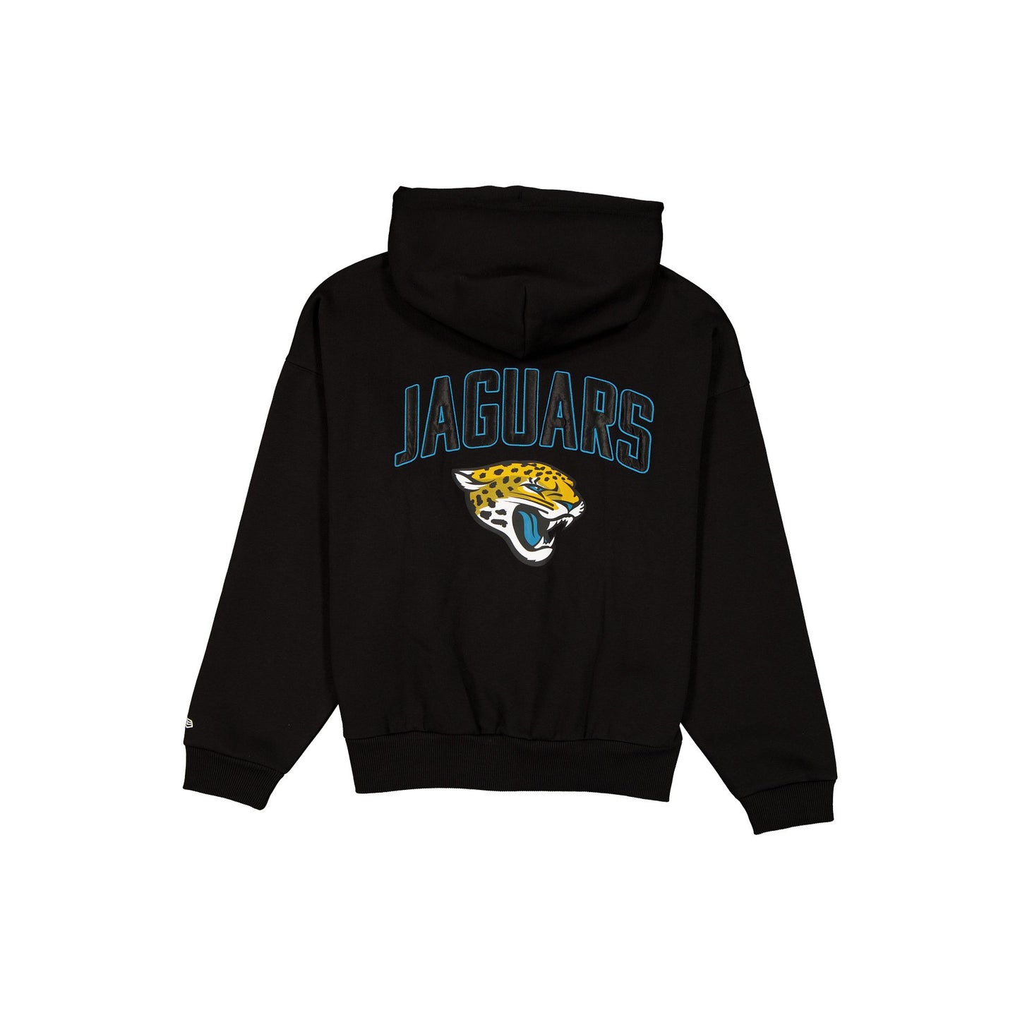 The Jacksonville Jaguars London Game Premium Full-Zip Hoodie features an embroidered Jaguars satin stitch wordmark at the left chest and logo at the right chest. Additional details include a satin applique wordmark the rear, front pockets, a full-zip closure, and adjustable drawstrings at the hood.