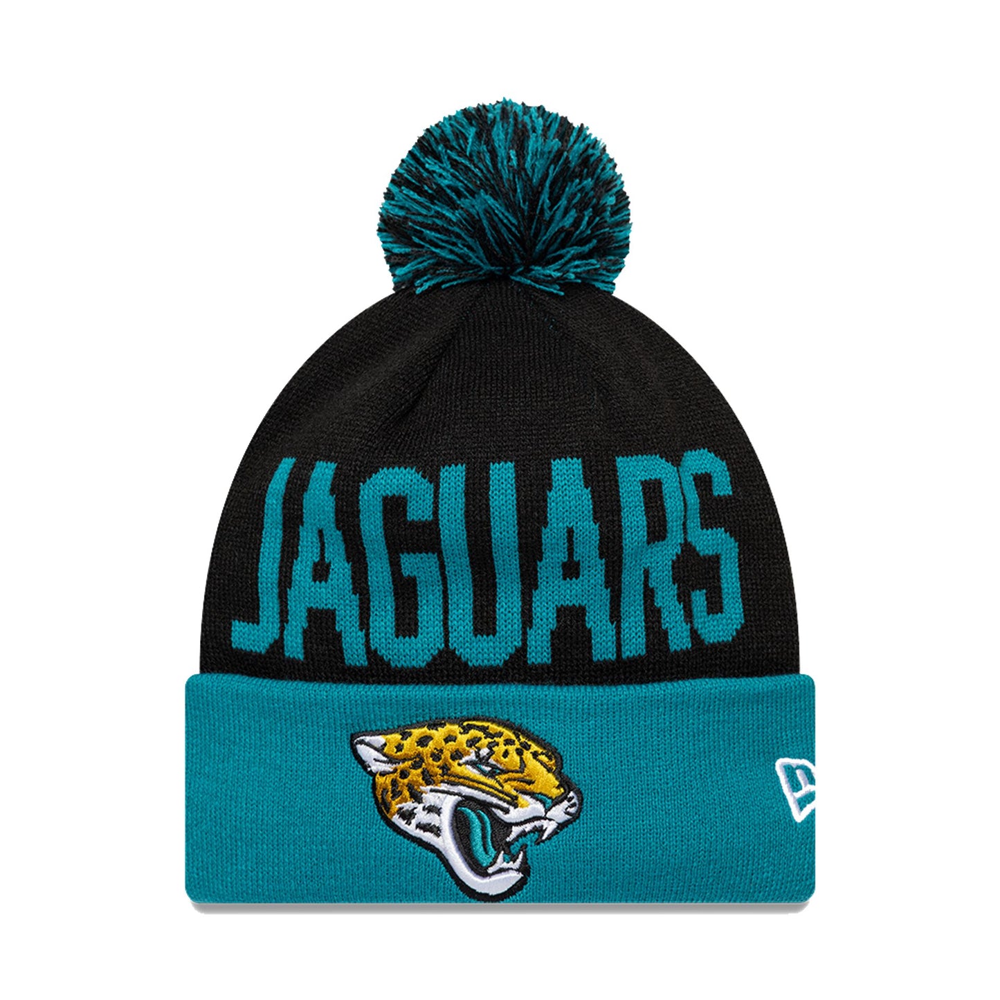 The Jacksonville Jaguars London Game Team Pom Knit features an embroidered Jaguars logo at the front cuff with a London Game patch at the rear and a one-time removable pom.