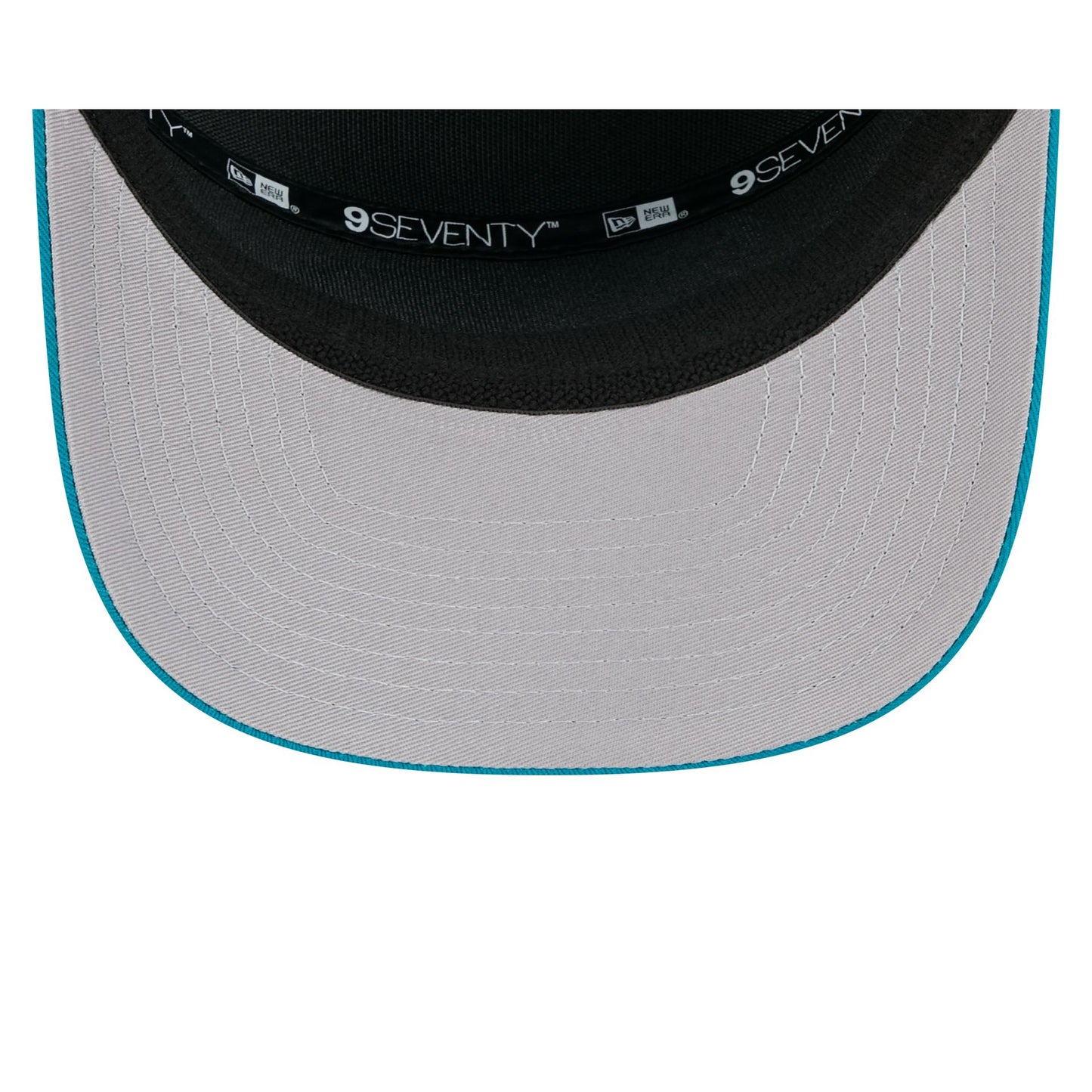 The Jacksonville Jaguars Split Panel 9SEVENTY Stretch-Snap features an embroidered Jaguars logo at the front panel with a split crown construction and a rope at the visor. Additional details include an adjustable stretch-snap closure at the rear and a gray undervisor.