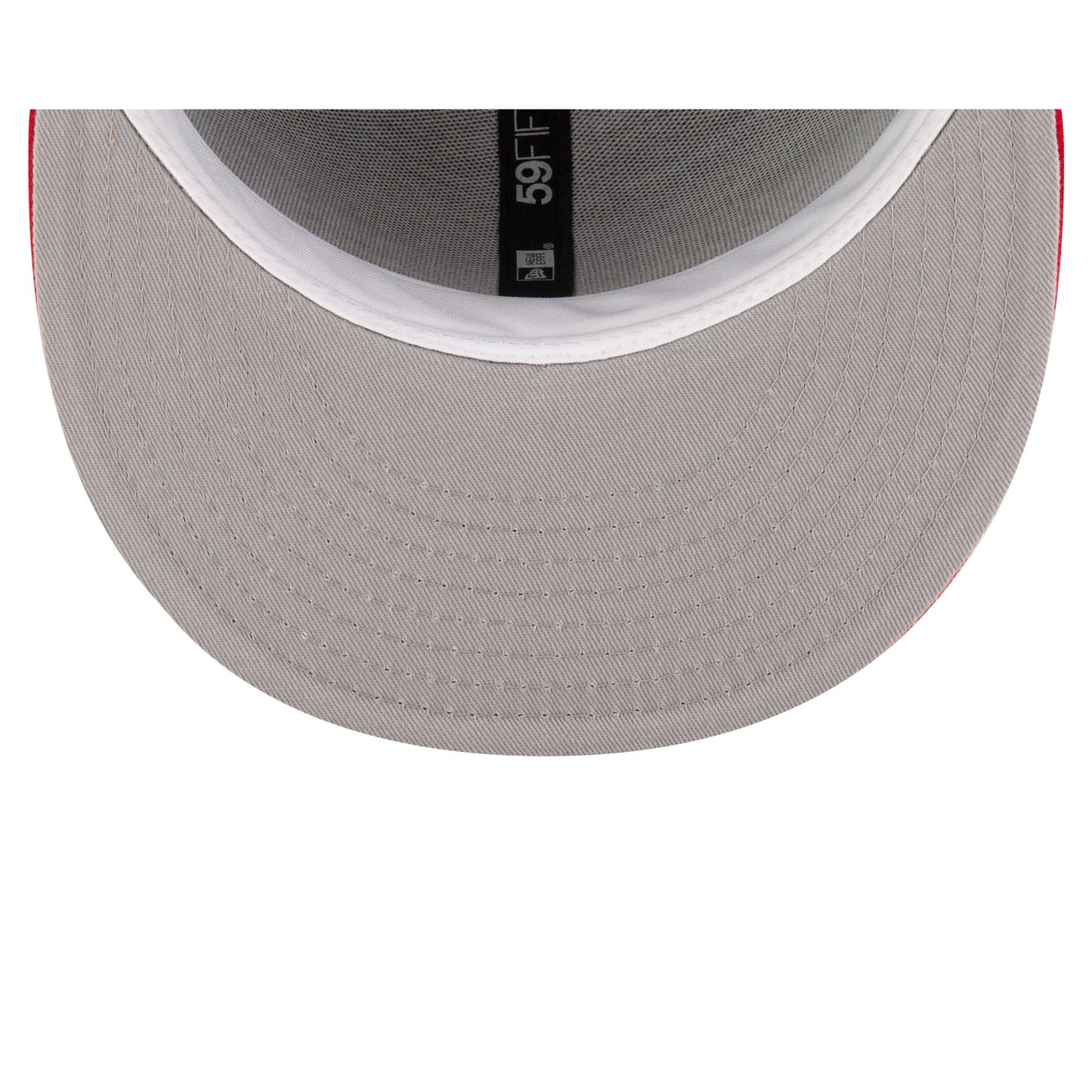 The Jayson Tatum x St. Louis Cardinals Birds on Bat 59FIFTY Fitted Cap features an embroidered Cardinals logo at the front panels with a matching MLB Batterman logo and Tatum's signature at the rear and a gray undervisor.