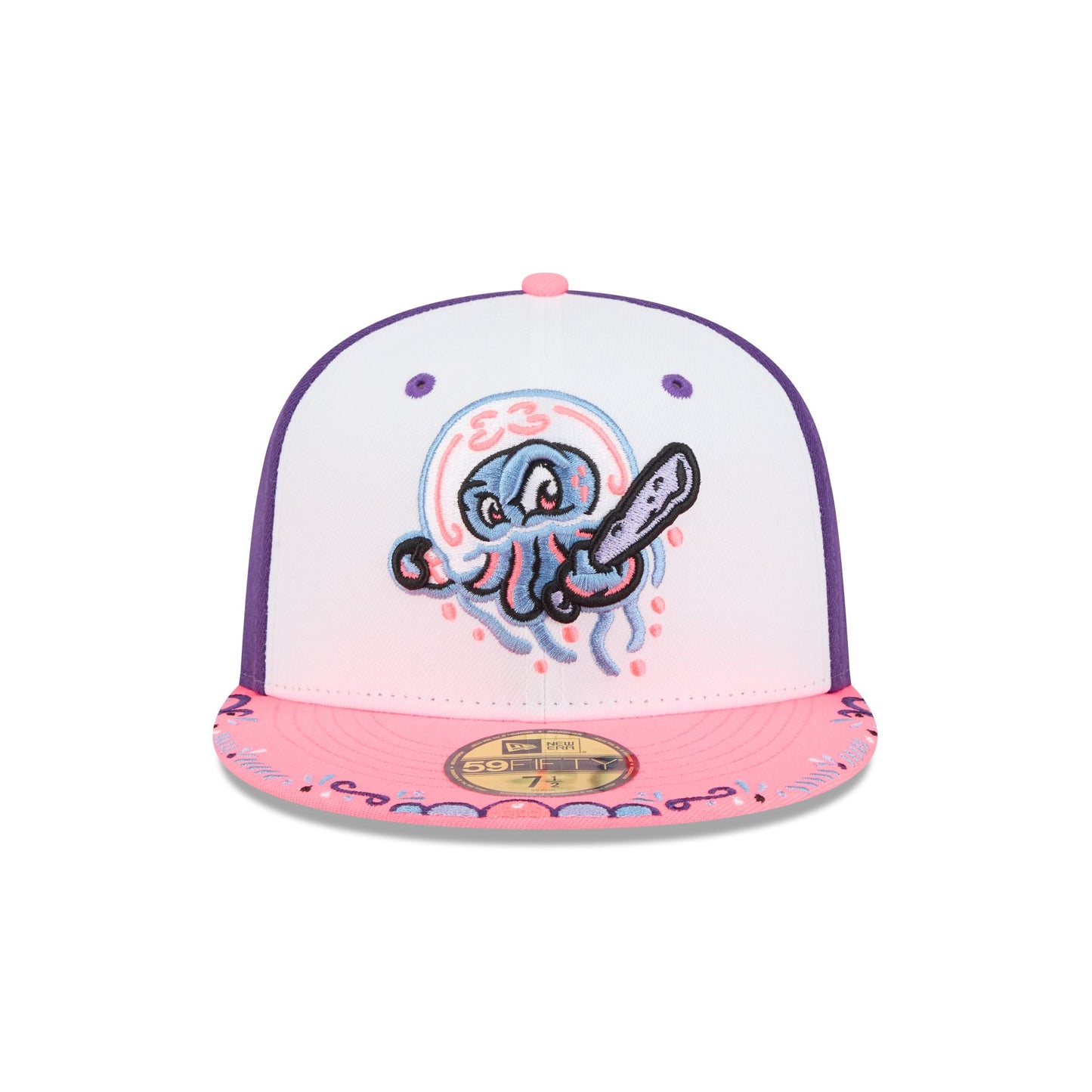 The Jersey Shore BlueClaws 2026 Copa de la Diversión 59FIFTY Fitted Cap features an embroidered BlueClaws logo at the front panels with a matching MiLB Batterman logo at the rear, a decorative embroidery at the visor, and a gray undervisor.