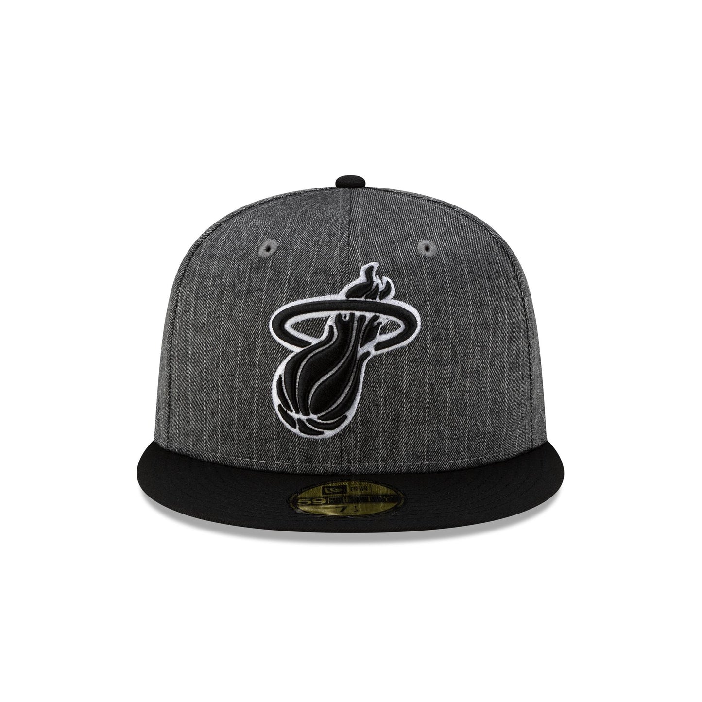 The Just Caps Black Pinstripe Miami Heat 59FIFTY Fitted Cap features an embroidered Heat logo at the front panels with a matching NBA Logoman at the rear. Additional details include a pinstripe fabrication throughout the cap and a gray undervisor.