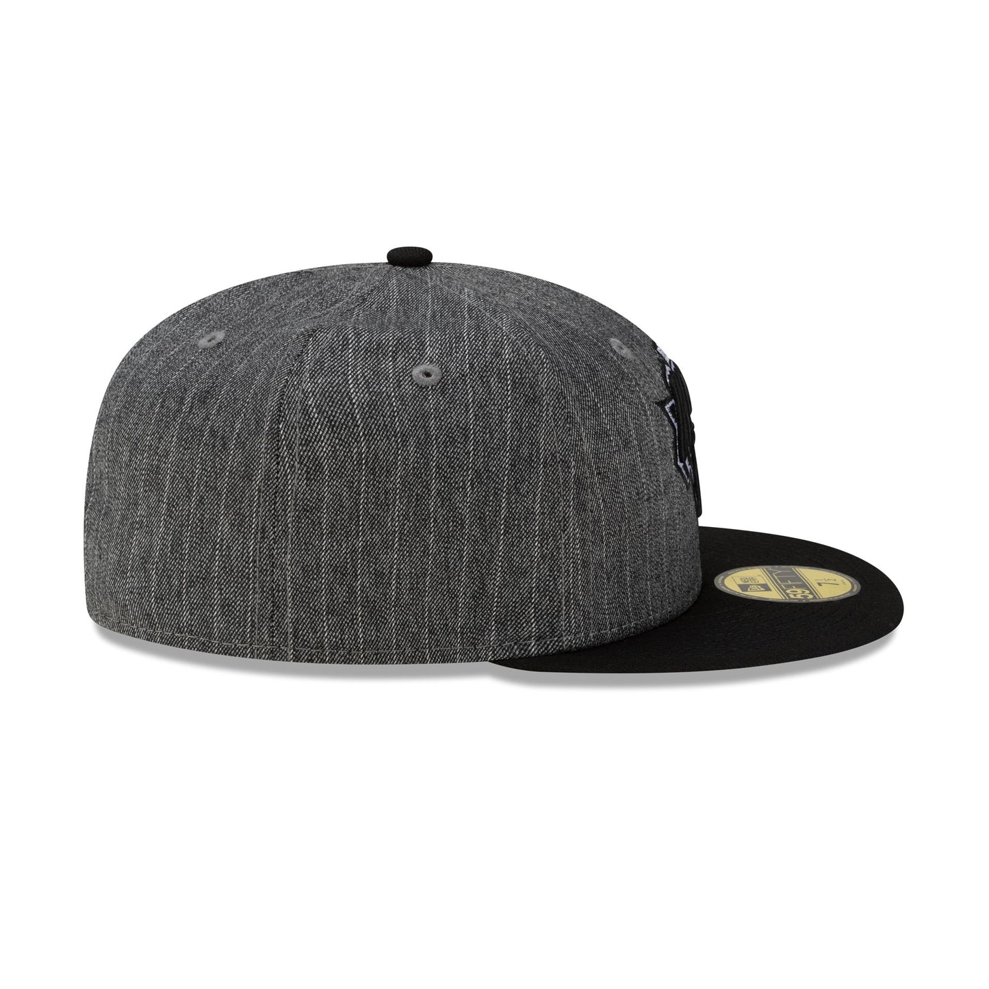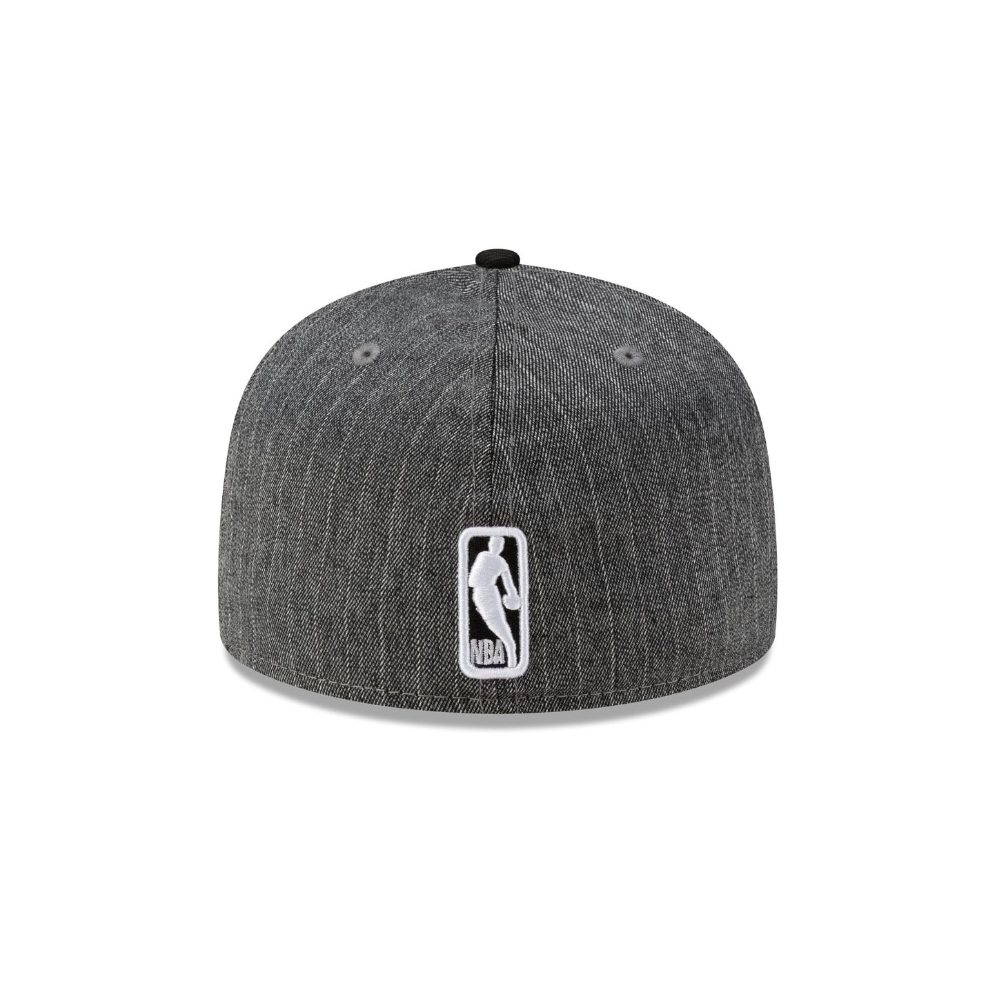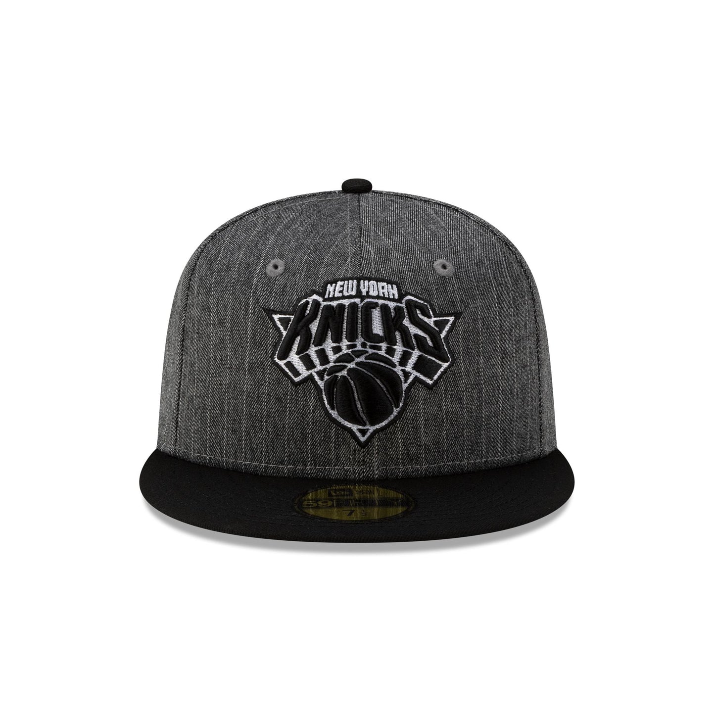 The Just Caps Black Pinstripe New York Knicks 59FIFTY Fitted Cap features an embroidered Knicks logo at the front panels with a matching NBA Logoman at the rear. Additional details include a pinstripe fabrication throughout the cap and a gray undervisor.