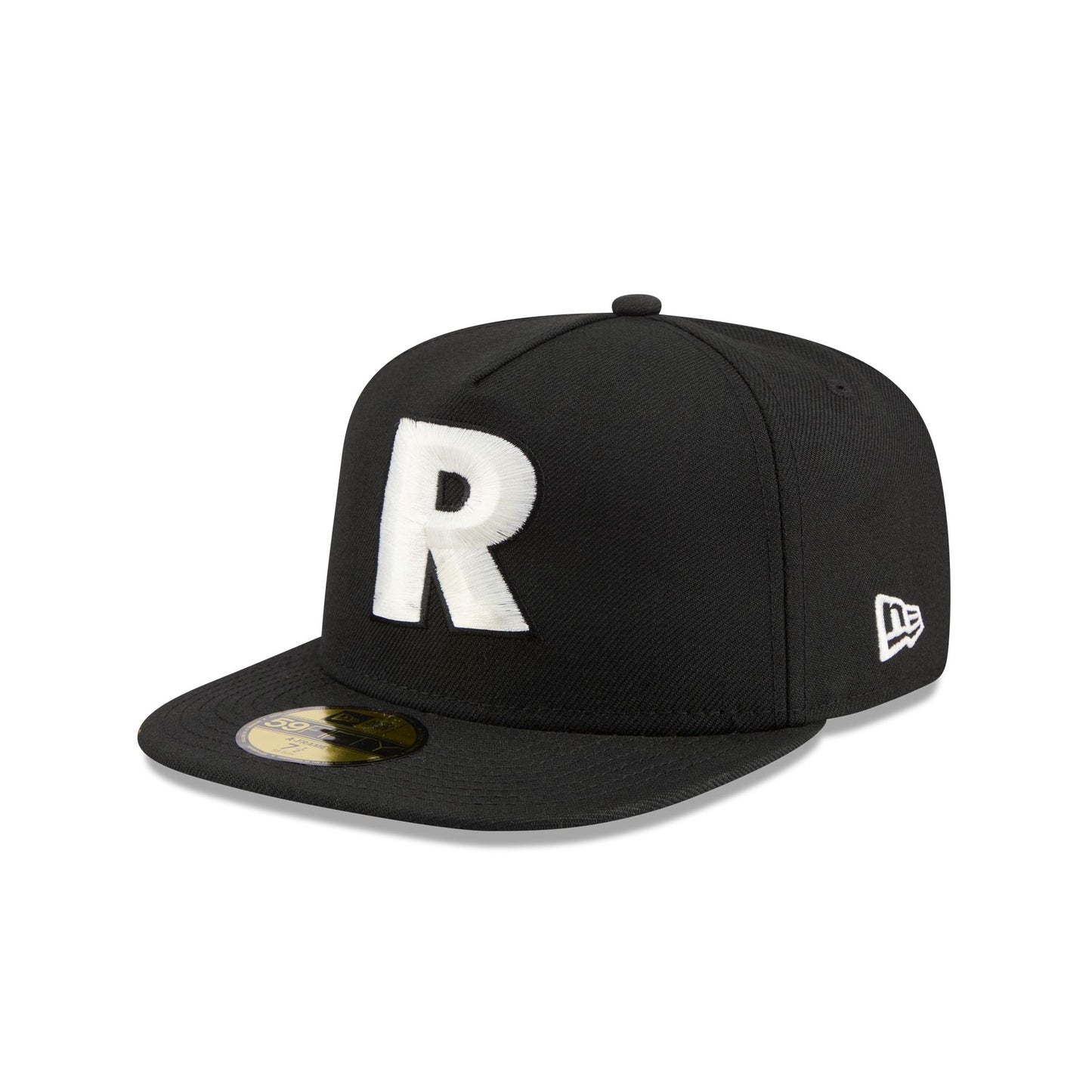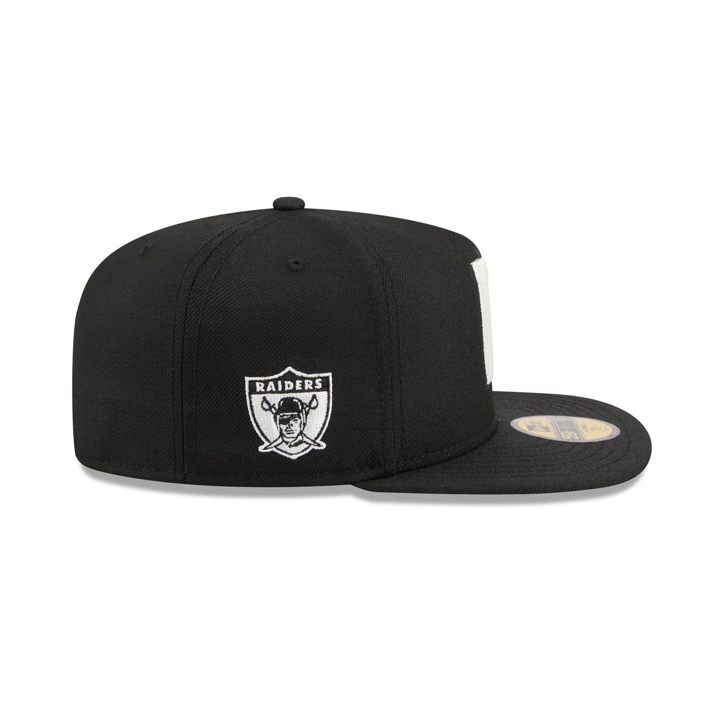 The Just Caps Chiseled Logo Las Vegas Raiders 59FIFTY A-Frame Fitted Cap features an embroidered Raiders chiseled historic logo at the front panels with a logo at the right-wear side. Additional details include the NFL Shield logo at the rear and a green undervisor.