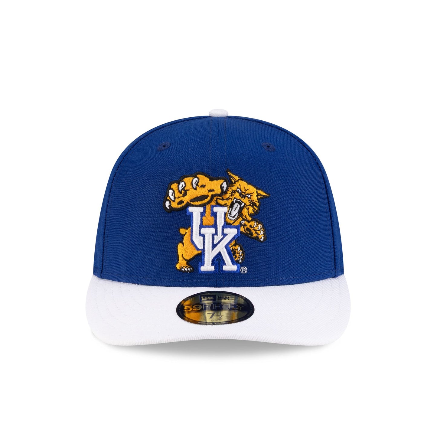 The Just Caps College Champions Sidepatch Kentucky Wildcats 59FIFTY Fitted Cap features an embroidered Wildcats College Vault logo at the front panels with a 1996 Final Four patch at the right-wear side and a green undervisor. This cap has a pre-curved visor.