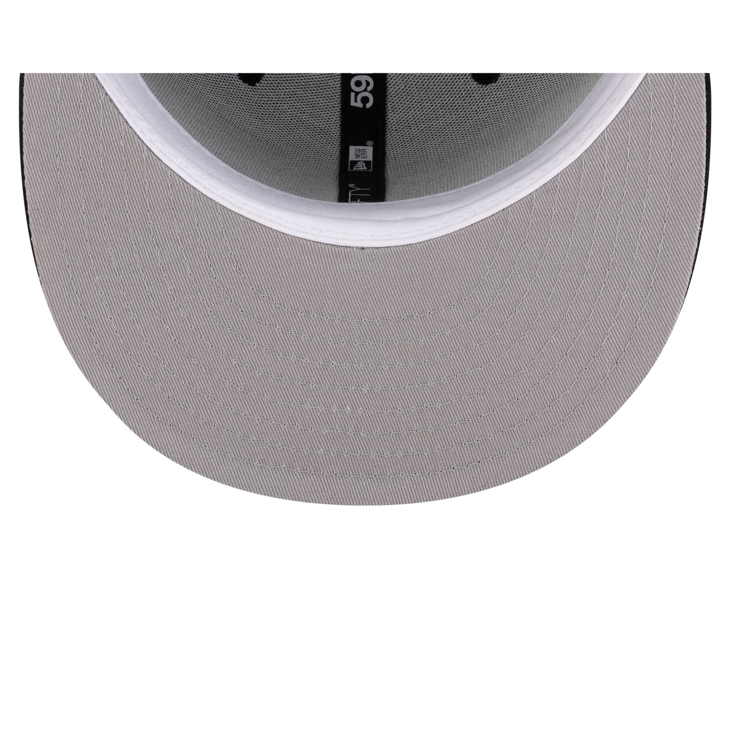 The Just Caps Gothic Script Athletics Logo 59FIFTY Fitted Cap features an embroidered Athletics Cooperstown logo at the front panels with a matching MLB Batterman logo at the rear and a gray undervisor.