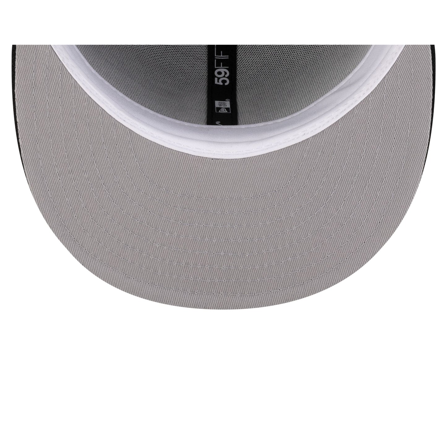 The Just Caps Gothic Script Philadelphia Phillies 59FIFTY Fitted Cap features an embroidered Phillies Cooperstown logo at the front panels with a matching MLB Batterman logo at the rear and a gray undervisor.