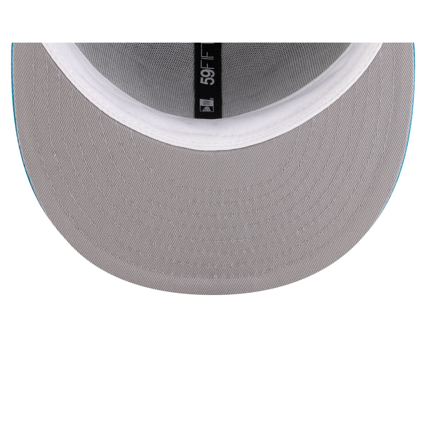 The Just Caps HBCU Delaware State Hornets 59FIFTY Fitted Cap features an embroidered Hornets logo at the front panels with a wordmark at the rear and a gray undervisor.