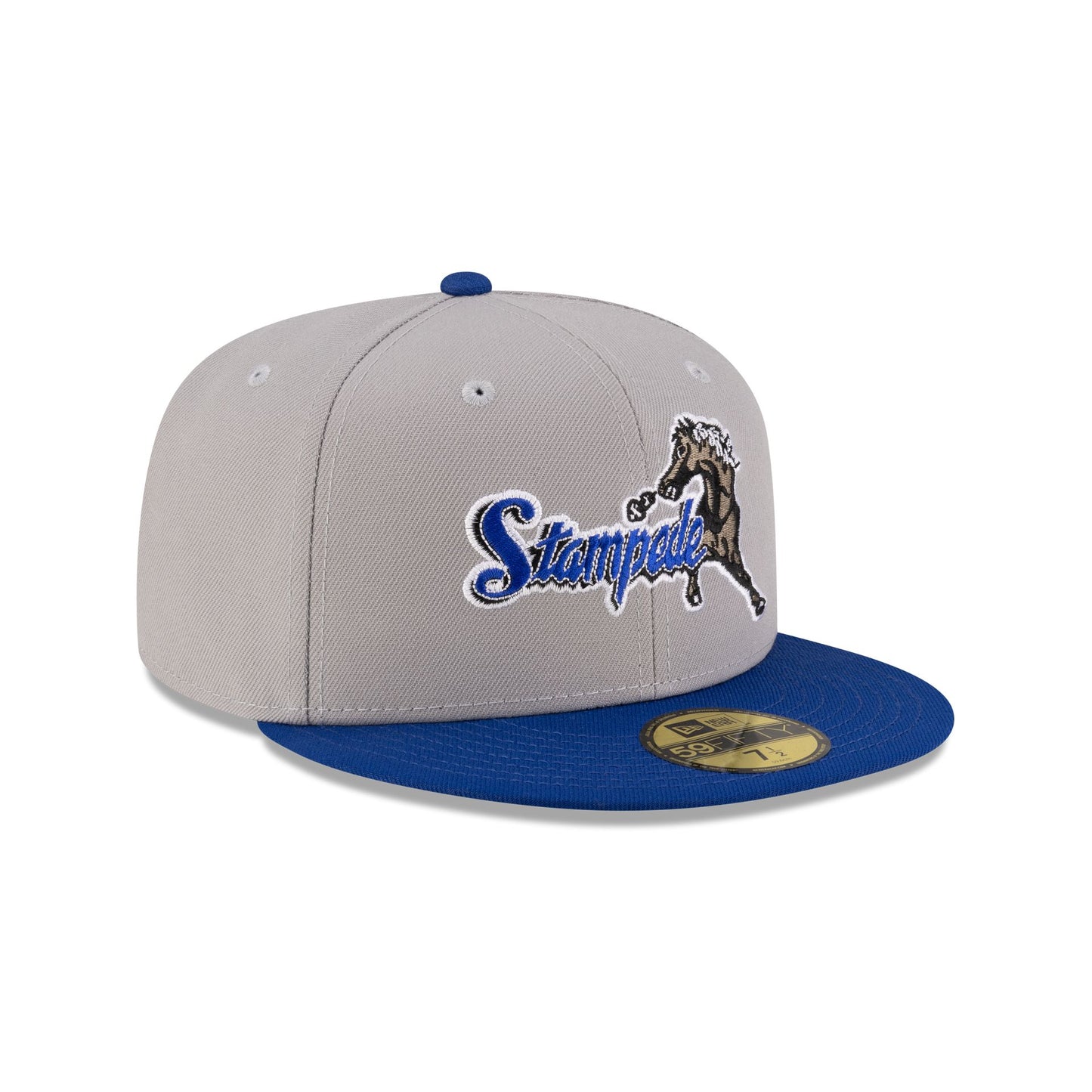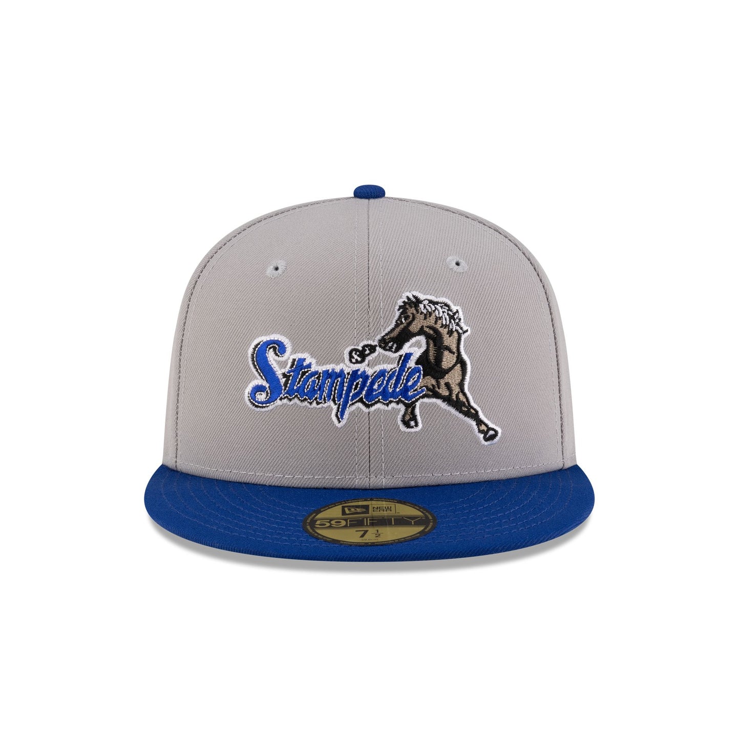 The Just Caps Hometown San Bernardino Stampede 59FIFTY Fitted Cap features an embroidered Stampede logo at the front panels with a matching MiLB Batterman logo at the rear and a gray undervisor.