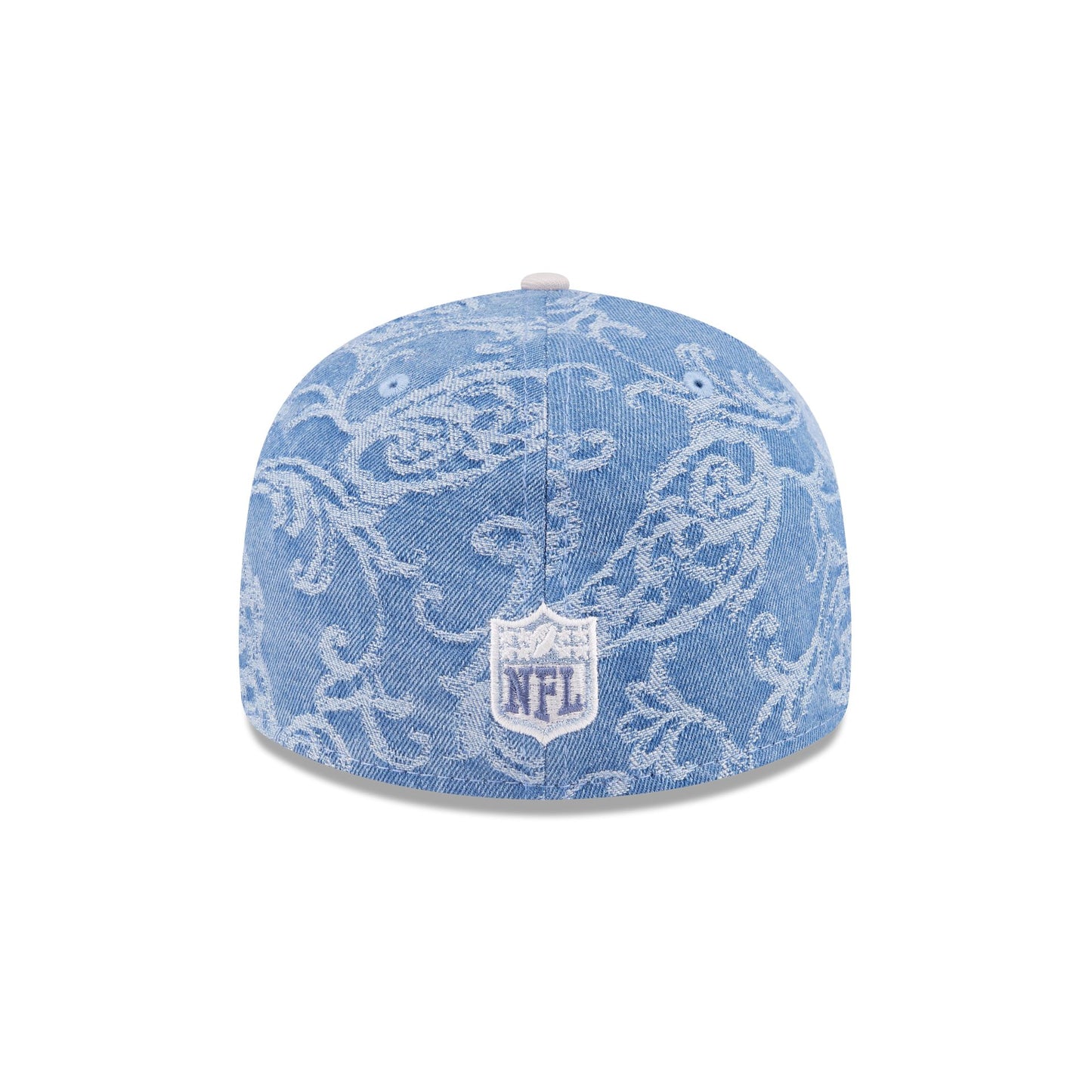 The Just Caps Jacquard Denim Baltimore Ravens Retro Crown 59FIFTY Fitted Cap features an embroidered Ravens logo at the front panels with a matching NFL Shield at the rear, a team wordmark at the right-wear side, and a gray undervisor.