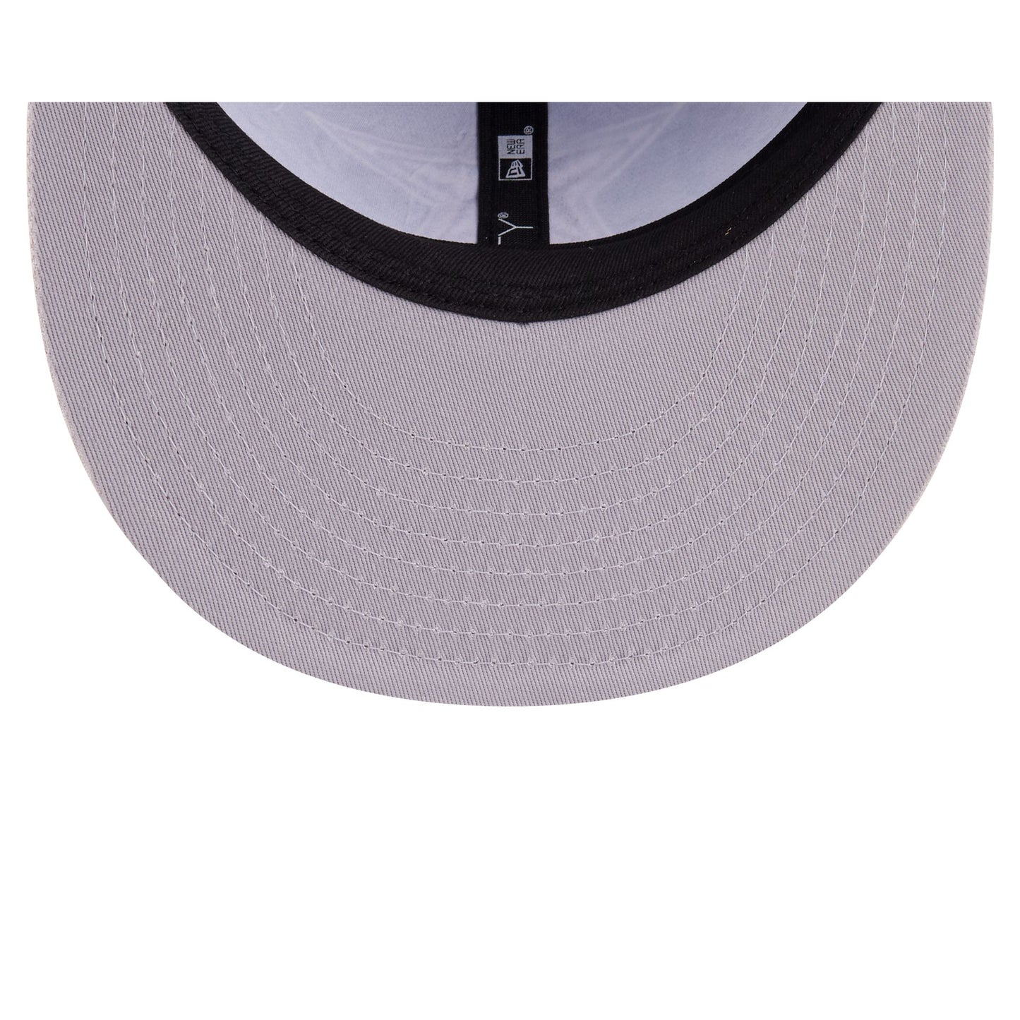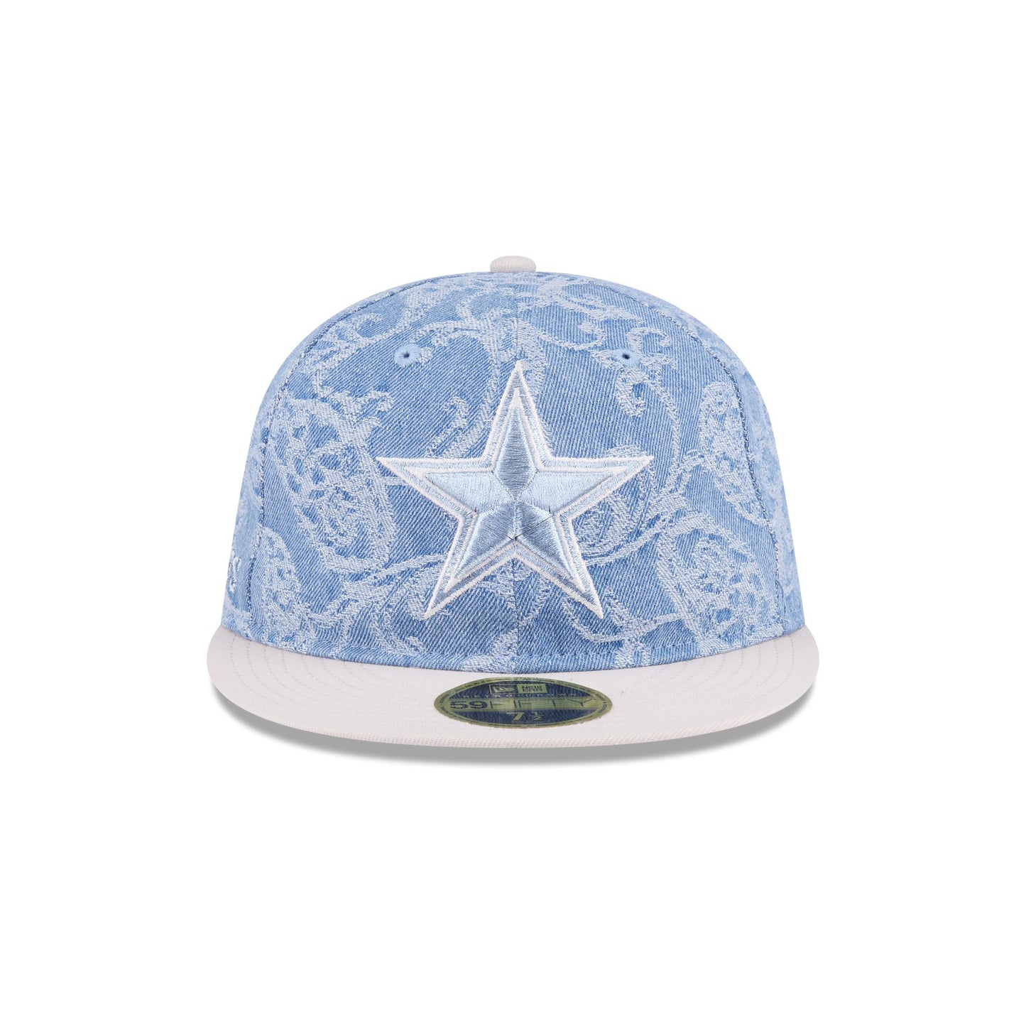 The Just Caps Jacquard Denim Dallas Cowboys Retro Crown 59FIFTY Fitted Cap features an embroidered Cowboys logo at the front panels with a matching NFL Shield at the rear, a team wordmark at the right-wear side, and a gray undervisor.