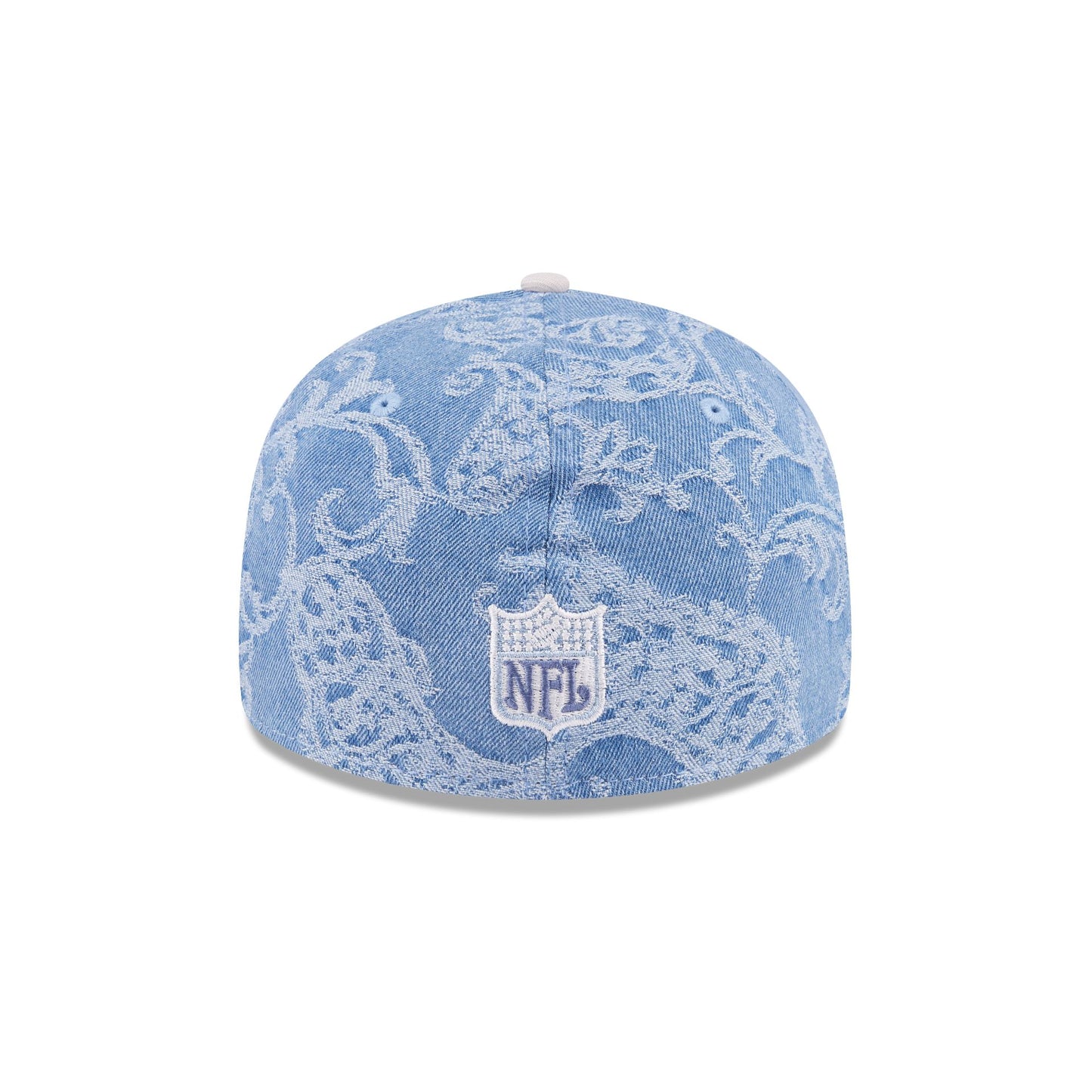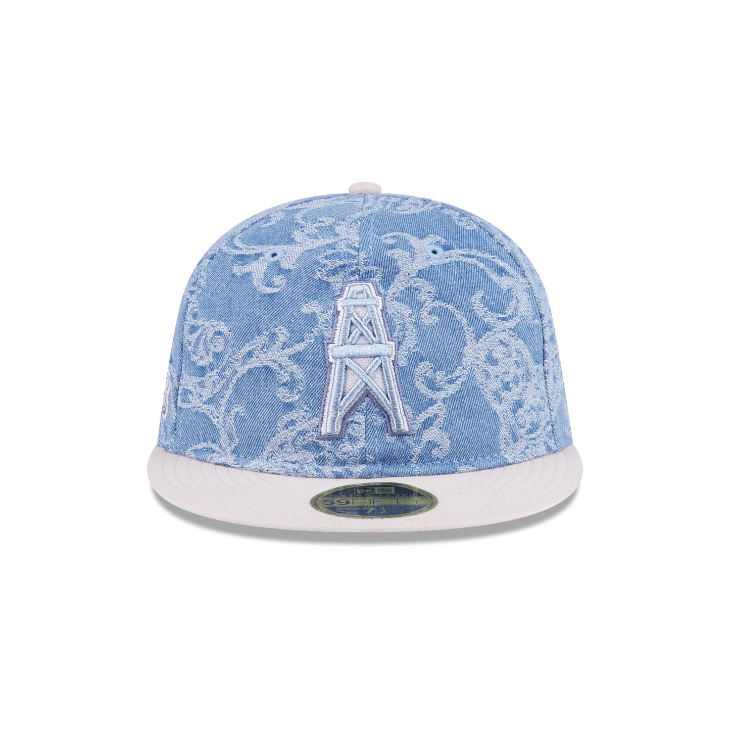 The Just Caps Jacquard Denim Oilers Retro Crown 59FIFTY Fitted Cap features an embroidered Oilers Historic logo at the front panels with a matching NFL Shield at the rear, a team wordmark at the right-wear side, and a gray undervisor.