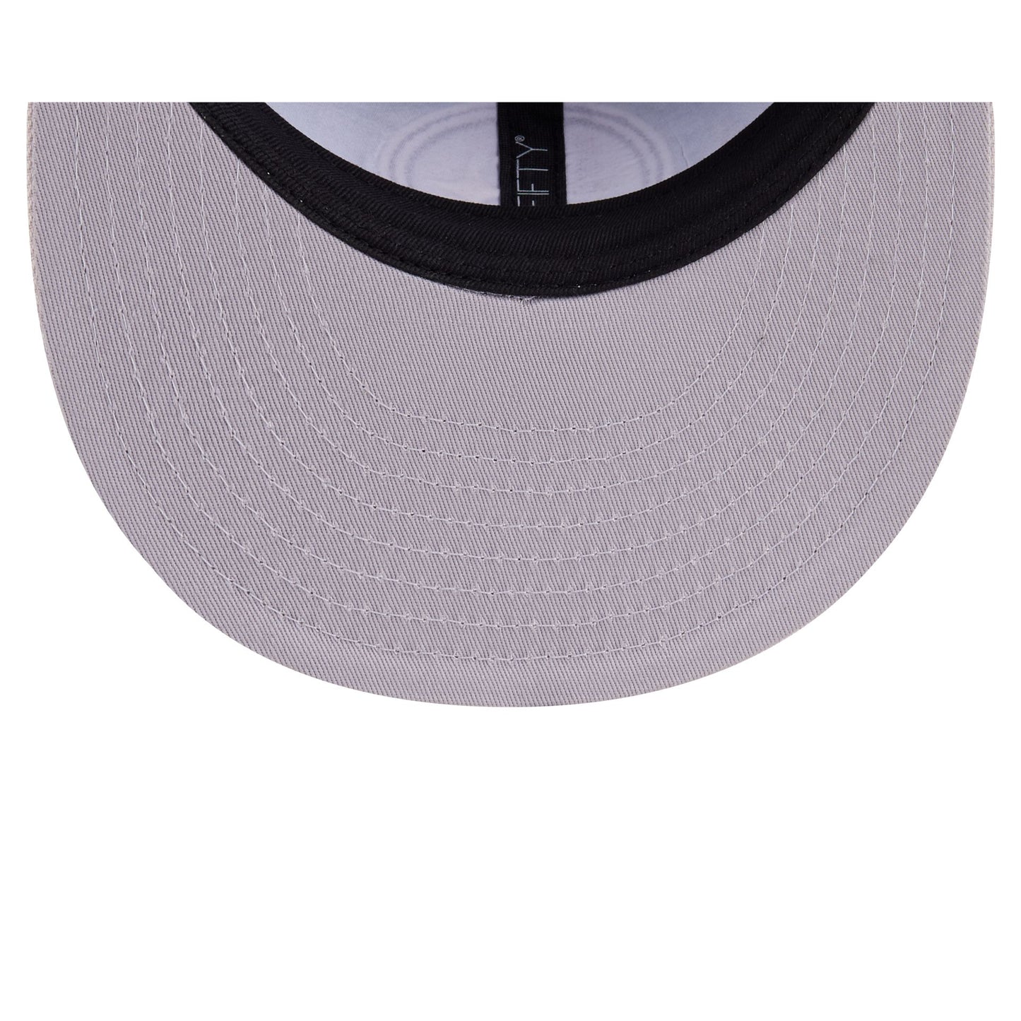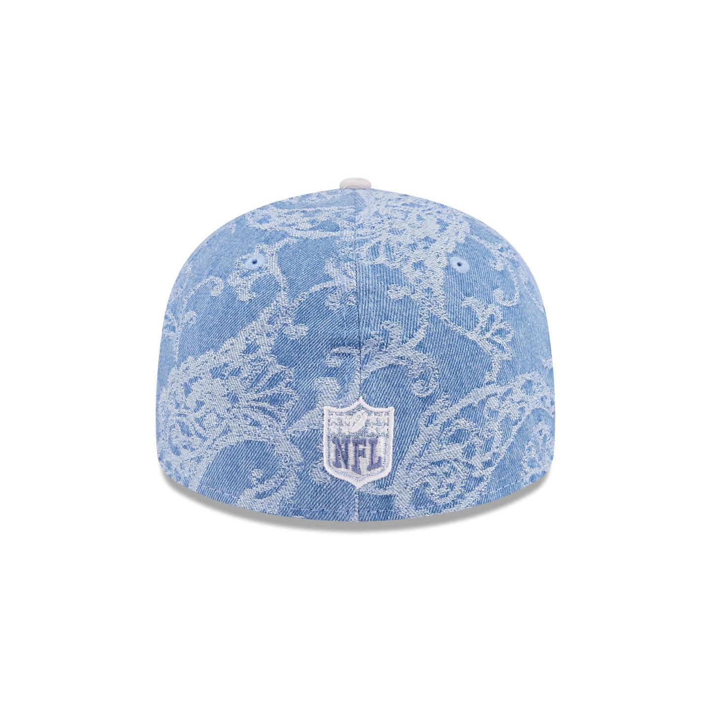 The Just Caps Jacquard Denim Pittsburgh Steelers Retro Crown 59FIFTY Fitted Cap features an embroidered Steelers logo at the front panels with a matching NFL Shield at the rear, a team wordmark at the right-wear side, and a gray undervisor.