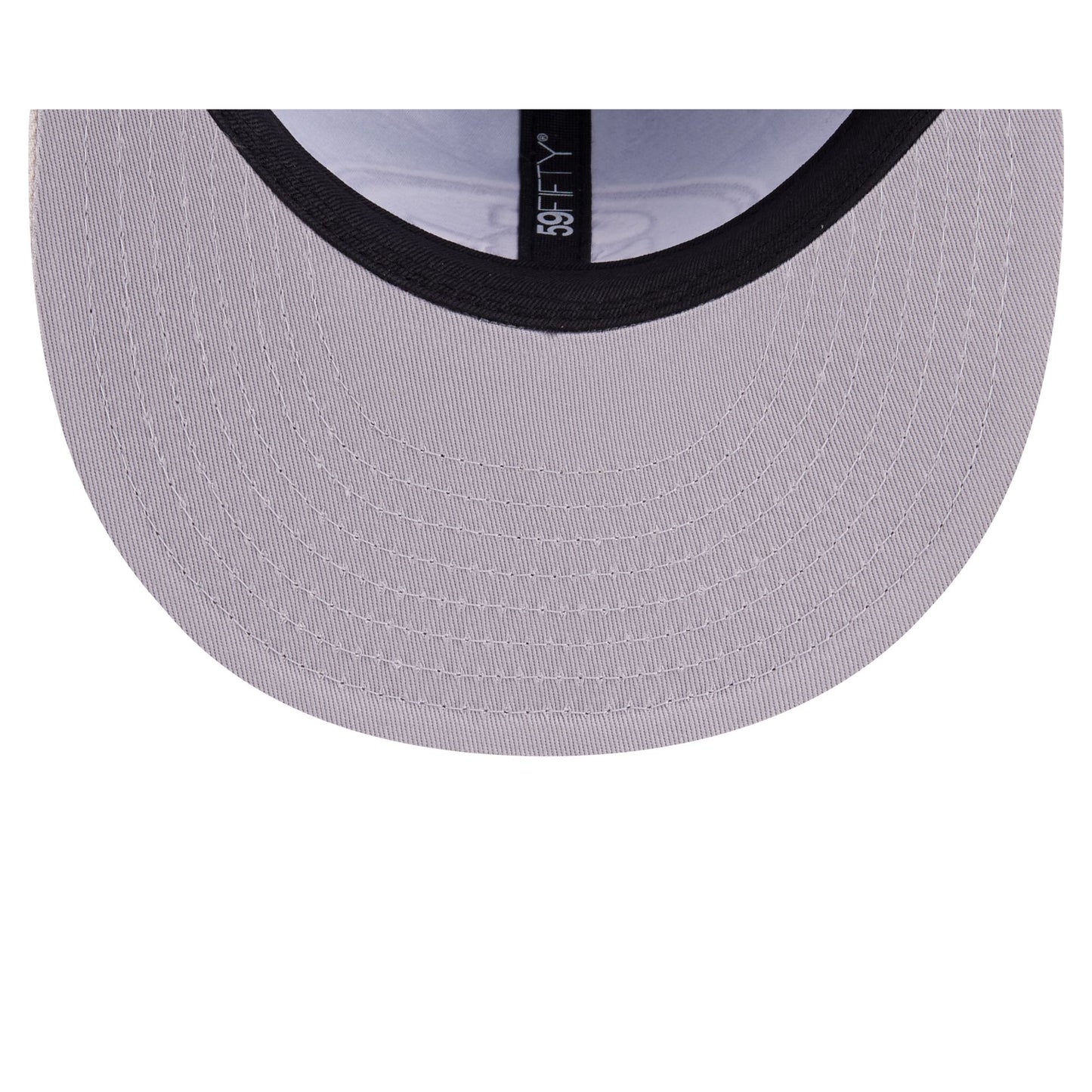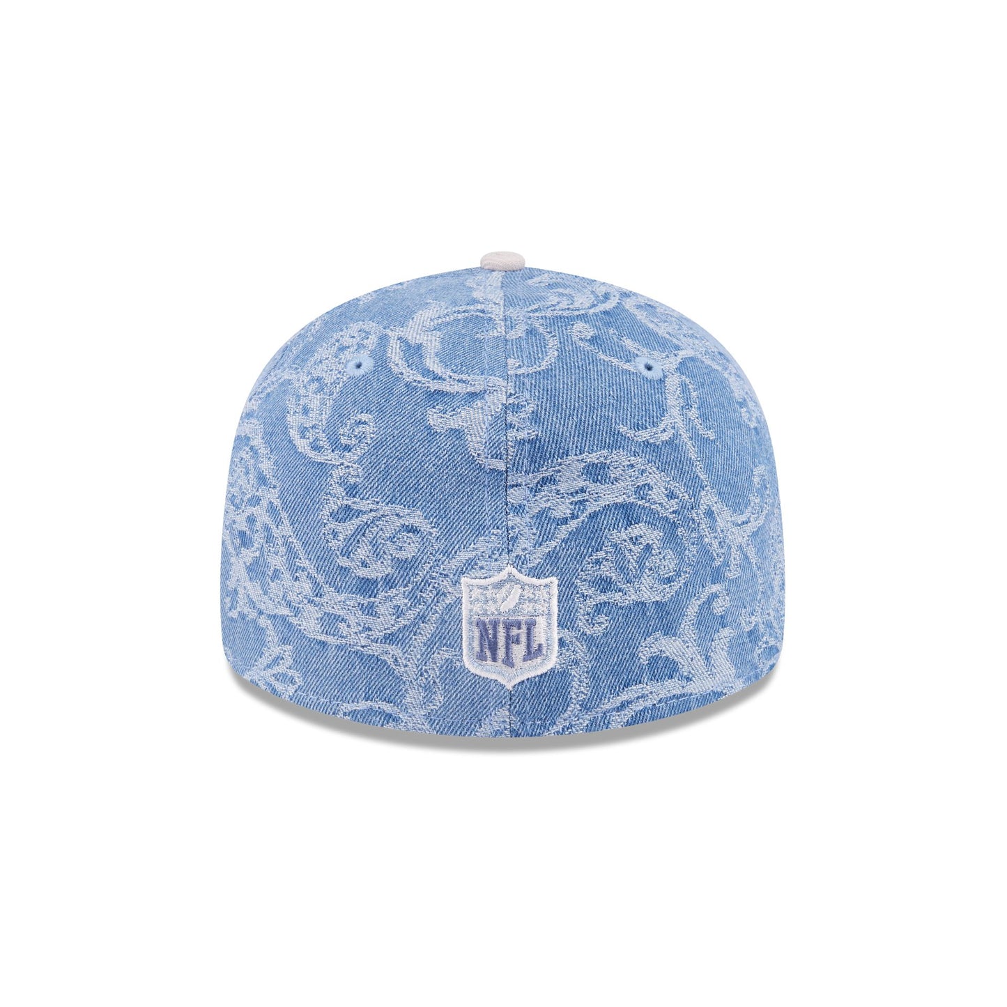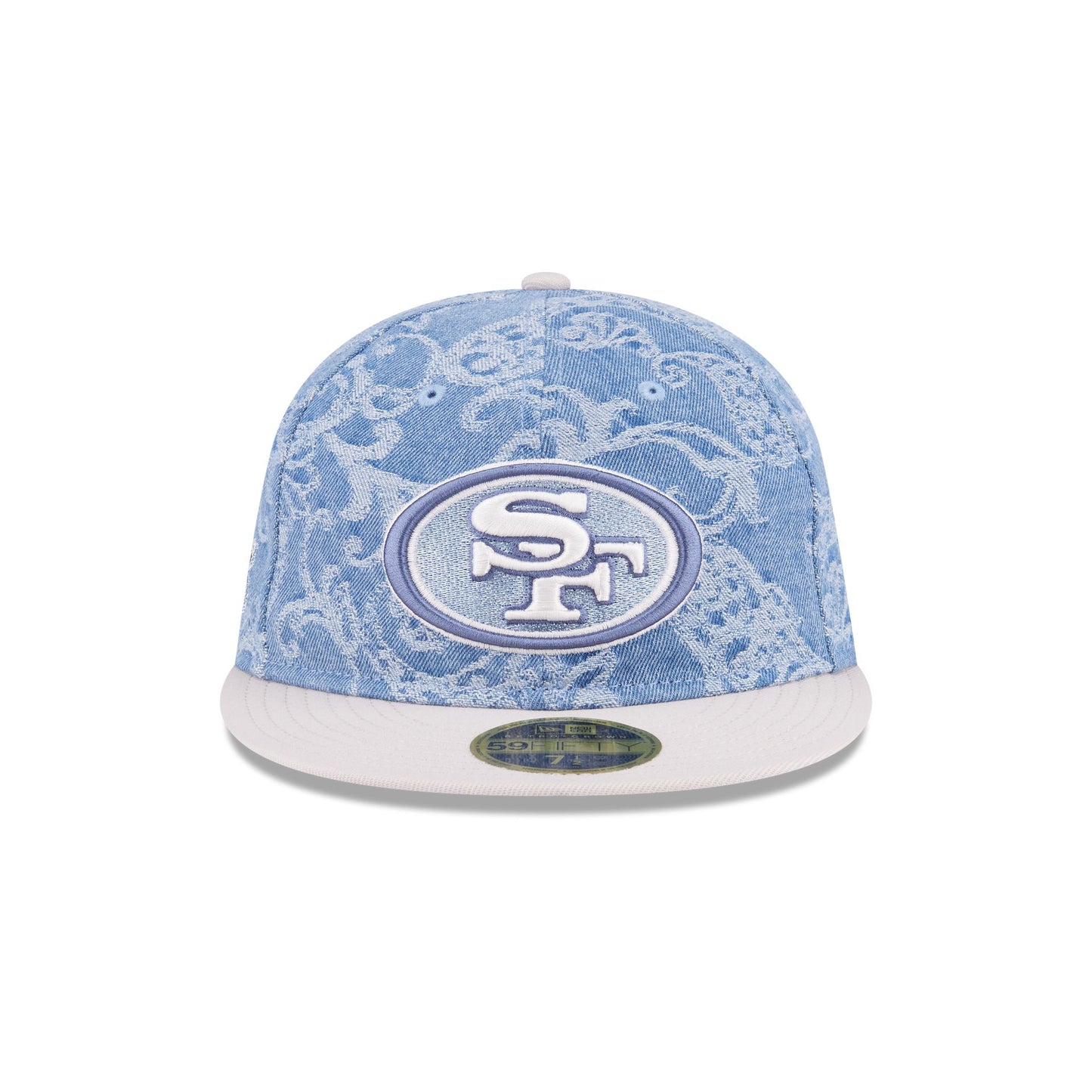 The Just Caps Jacquard Denim San Francisco 49ers Retro Crown 59FIFTY Fitted Cap features an embroidered 49ers logo at the front panels with a matching NFL Shield at the rear, a team wordmark at the right-wear side, and a gray undervisor.