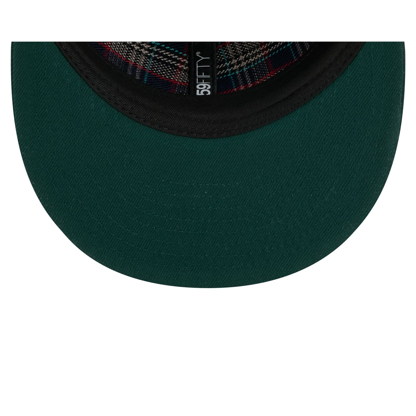 The Just Caps Plaid Interior Chicago Bulls Retro Crown 59FIFTY Fitted Cap features an embroidered Bulls wordmark at the front panels with a matching NBA Logoman at the rear, a green visor, and a plaid lined interior.