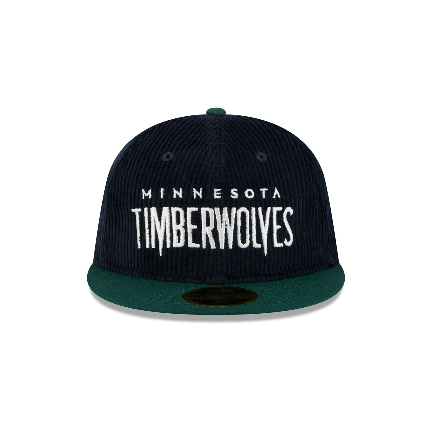 The Just Caps Plaid Interior Minnesota Timberwolves Retro Crown 59FIFTY Fitted Cap features an embroidered Timberwolves wordmark at the front panels with a matching NBA Logoman at the rear, a green visor, and a plaid lined interior.