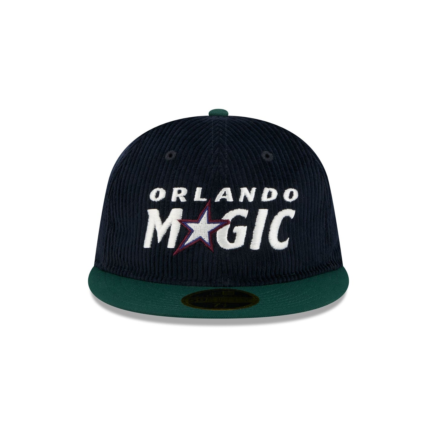 The Just Caps Plaid Interior Orlando Magic Retro Crown 59FIFTY Fitted Cap features an embroidered Magic wordmark at the front panels with a matching NBA Logoman at the rear, a green visor, and a plaid lined interior.