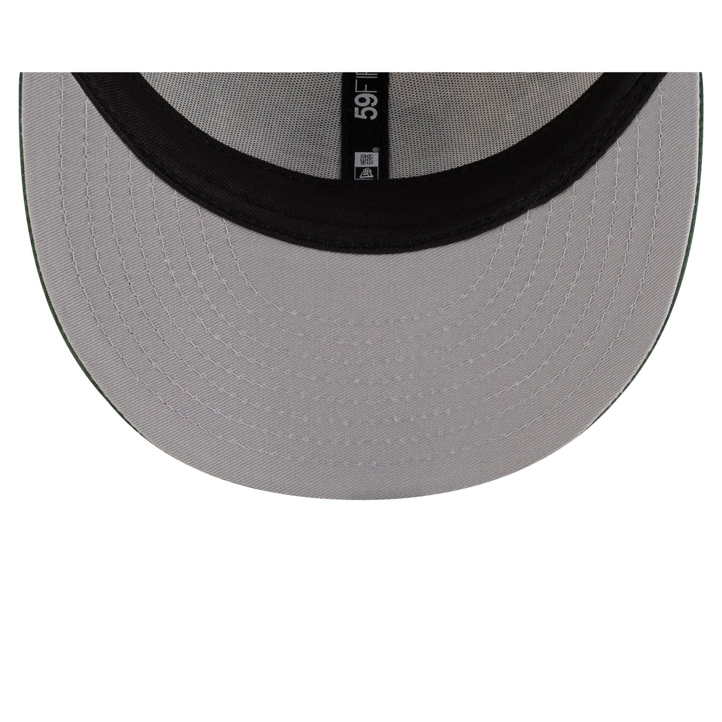 The Just Caps Realtree Green Bay Packers Low Profile 59FIFTY Fitted Cap features an embroidered Packers wordmark and helmet patch at the front panels with a matching NFL Shield at the rear. Additional details include a Super Bowl XXXI patch at the right-wear side with a team color visor and a gray undervisor.