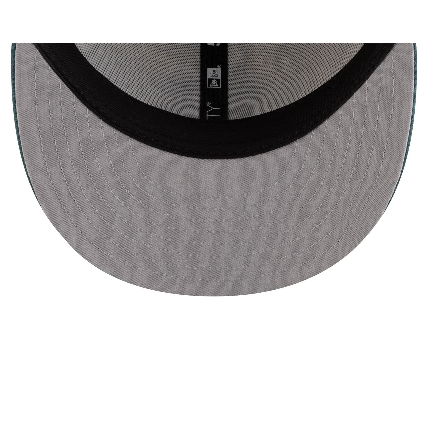 The Just Caps Realtree Philadelphia Eagles Low Profile 59FIFTY Fitted Cap features an embroidered Eagles wordmark and helmet patch at the front panels with a matching NFL Shield at the rear. Additional details include a Super Bowl LII patch at the right-wear side with a team color visor and a gray undervisor.