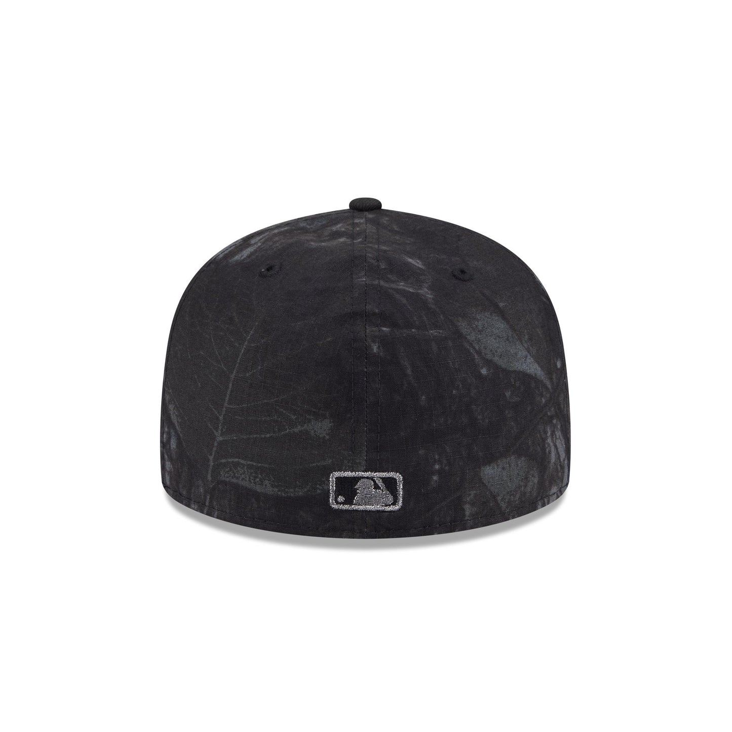 The Just Caps Ripstop Camo Atlanta Braves 59FIFTY A-Frame Fitted Cap features an embroidered Braves logo at the front panels against a camo fabrication from Three Looms Japan Fabircs. Additional details include a 2017 Inaugural Season patch at the right-wear side, a gray undervisor, and an MLB Batterman logo at the rear.