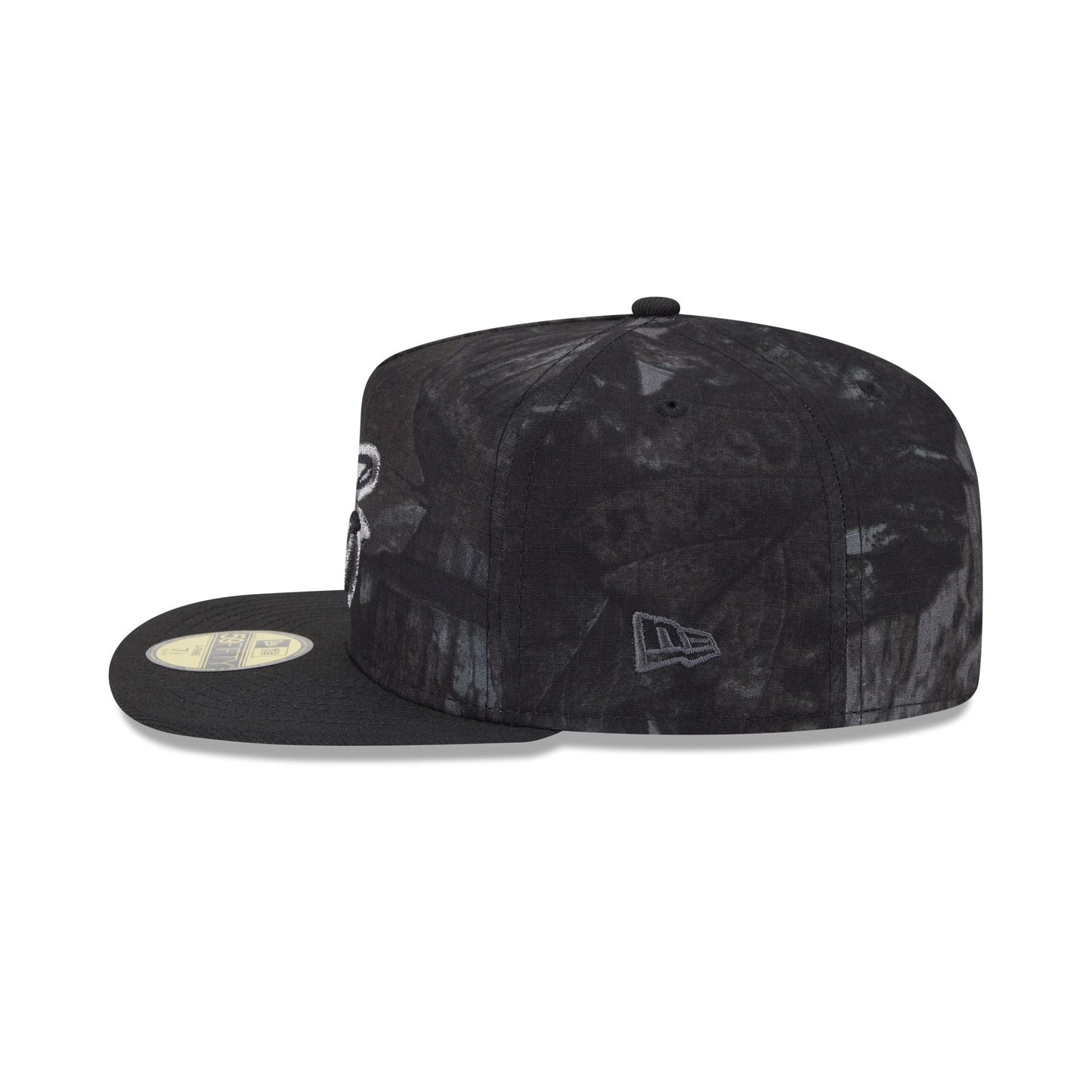 The Just Caps Ripstop Camo Baltimore Orioles 59FIFTY A-Frame Fitted Cap features an embroidered Orioles logo at the front panels against a camo fabrication from Three Looms Japan Fabircs. Additional details include a 60th Anniversary patch at the right-wear side, a gray undervisor, and an MLB Batterman logo at the rear.