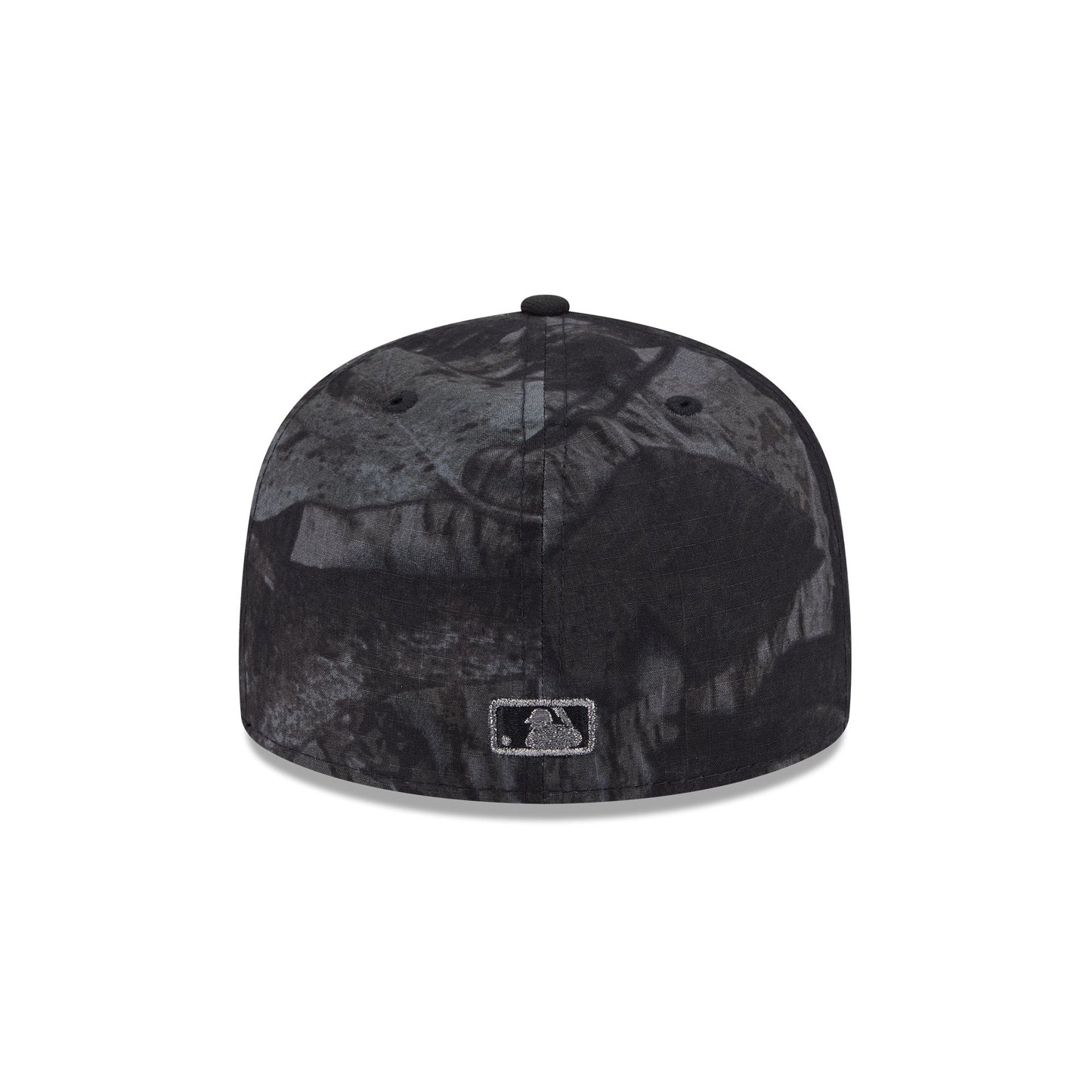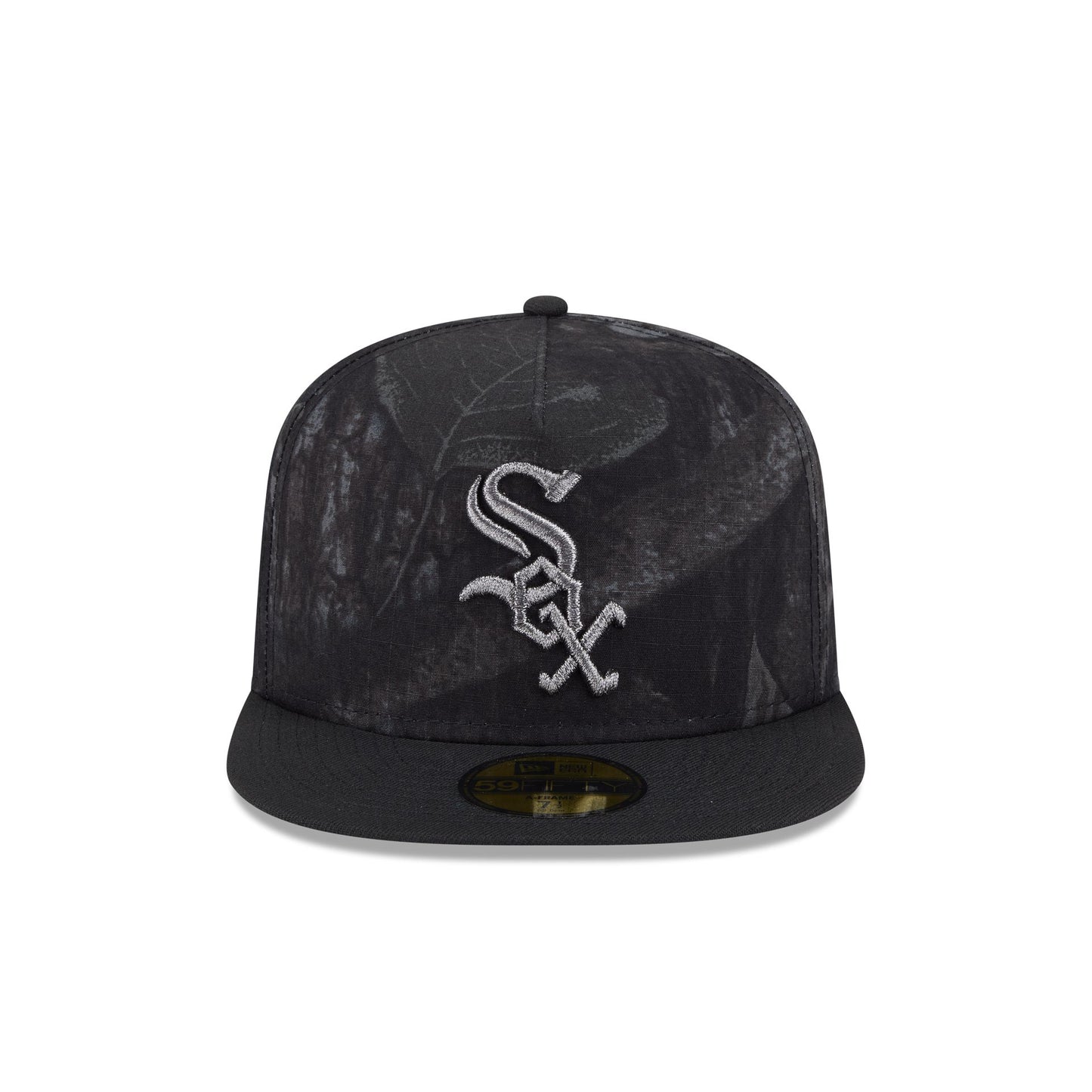 The Just Caps Ripstop Camo Chicago White Sox 59FIFTY A-Frame Fitted Cap features an embroidered White Sox logo at the front panels against a camo fabrication from Three Looms Japan Fabircs. Additional details include a 2005 World Series Champions patch at the right-wear side, a gray undervisor, and an MLB Batterman logo at the rear.