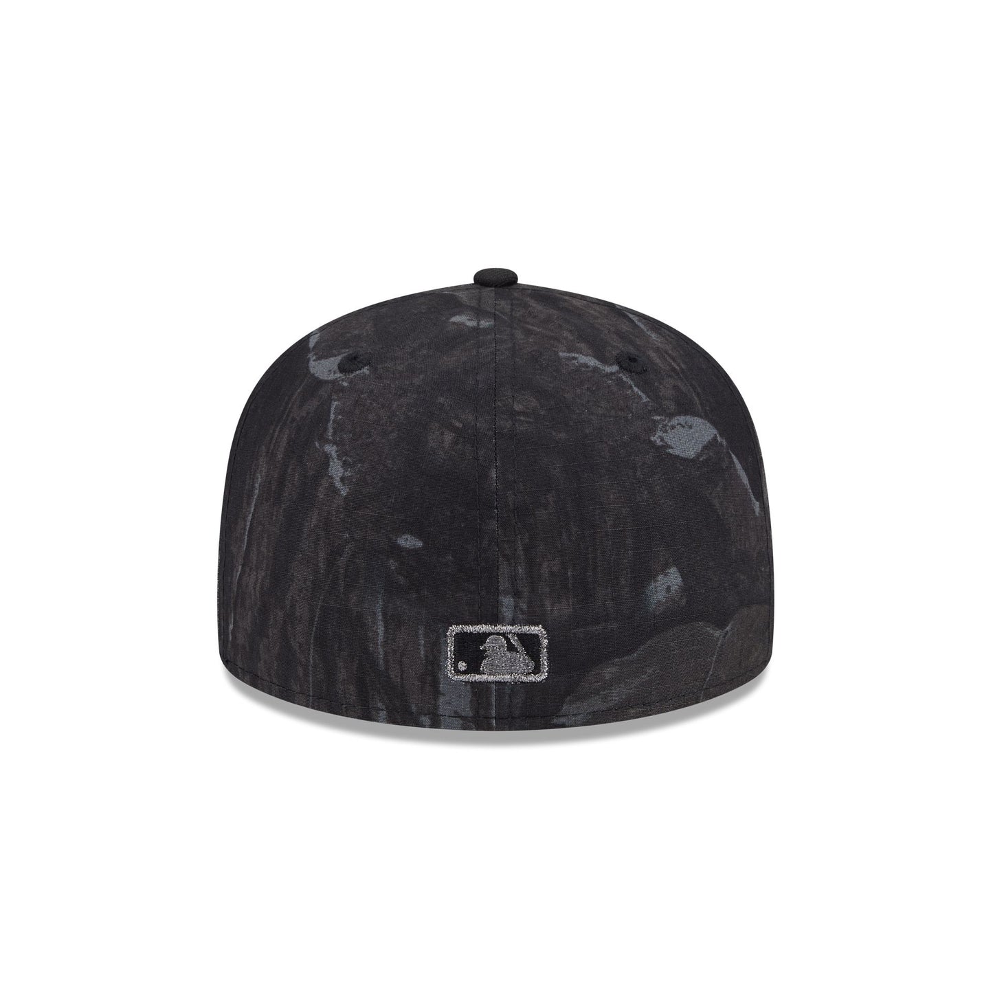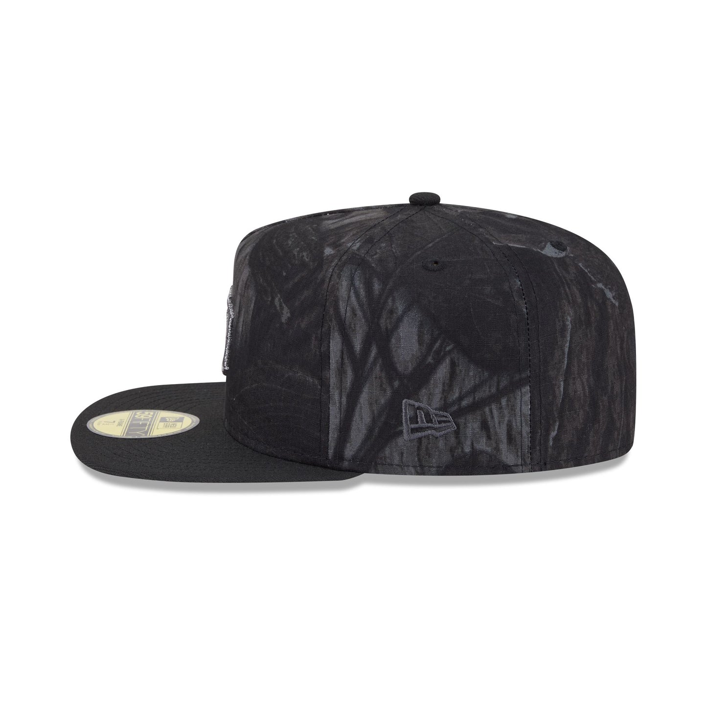 The Just Caps Ripstop Camo Detroit Tigers 59FIFTY A-Frame Fitted Cap features an embroidered Tigers logo at the front panels against a camo fabrication from Three Looms Japan Fabircs. Additional details include a Briggs Stadium patch at the right-wear side, a gray undervisor, and an MLB Batterman logo at the rear.