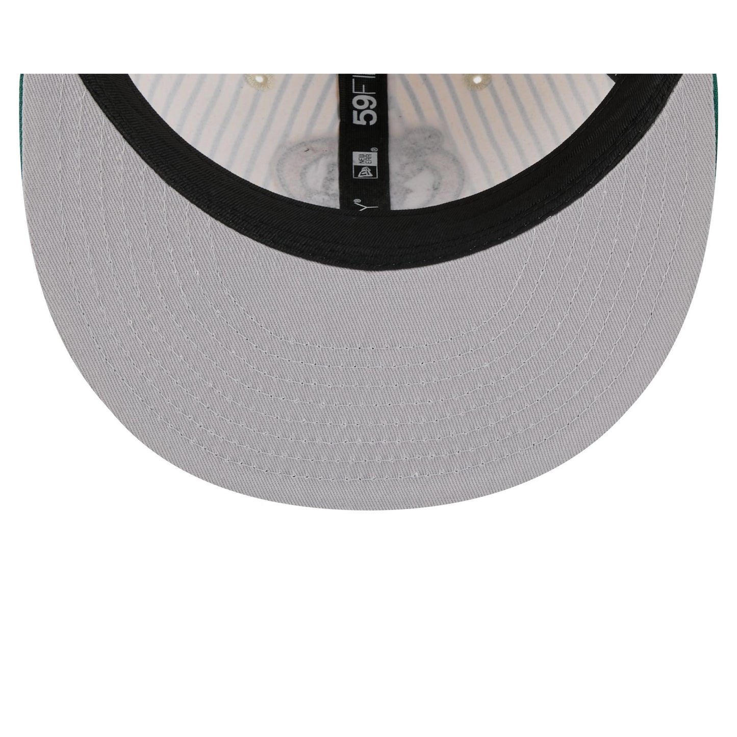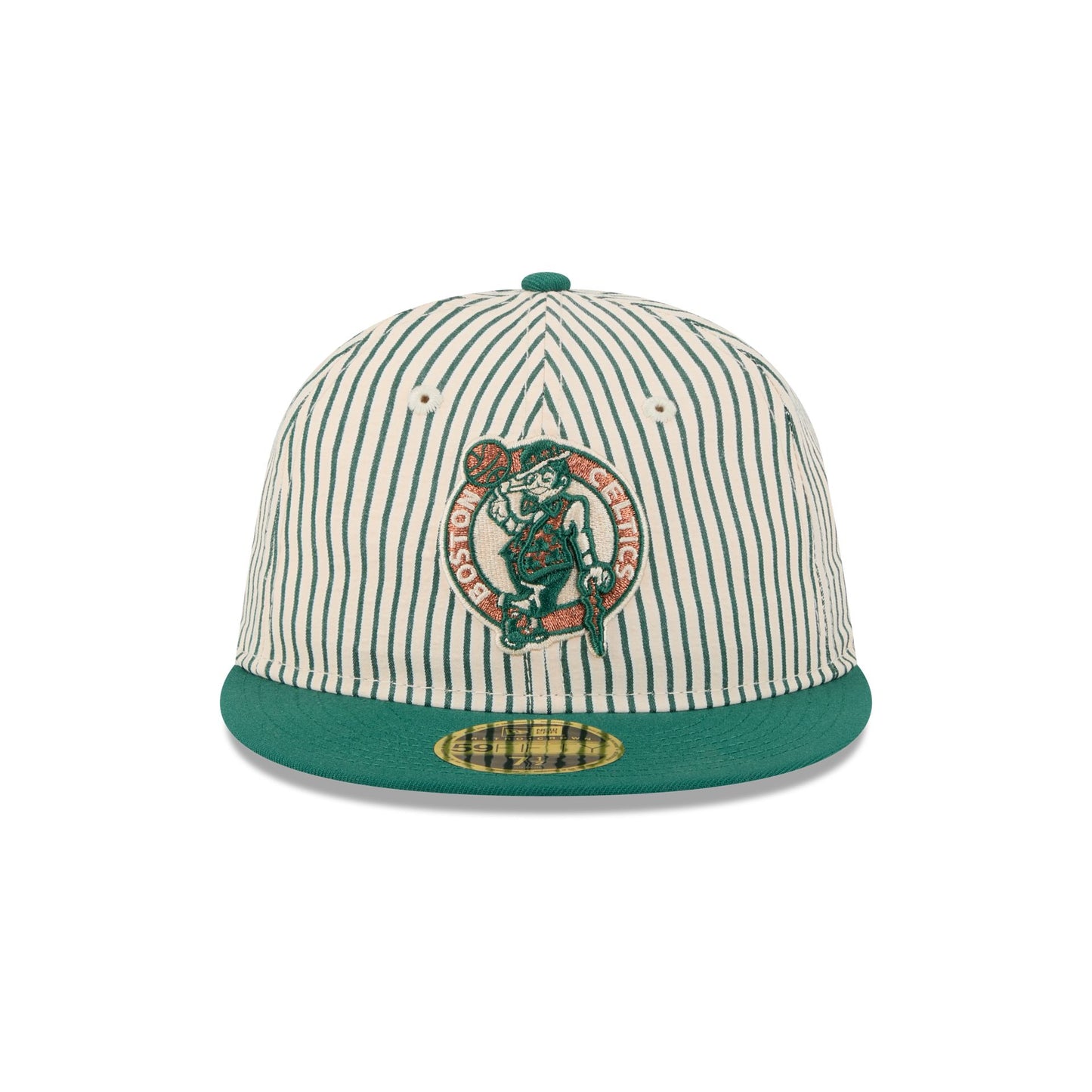 The Just Caps Seersucker Boston Celtics Retro Crown 59FIFTY Fitted Cap features an embroidered Celtics green and bronze logo at the front panels against a seersucker fabrication throughout the cap. Additional details include matching NBA Logoman at the rear and a gray undervisor.