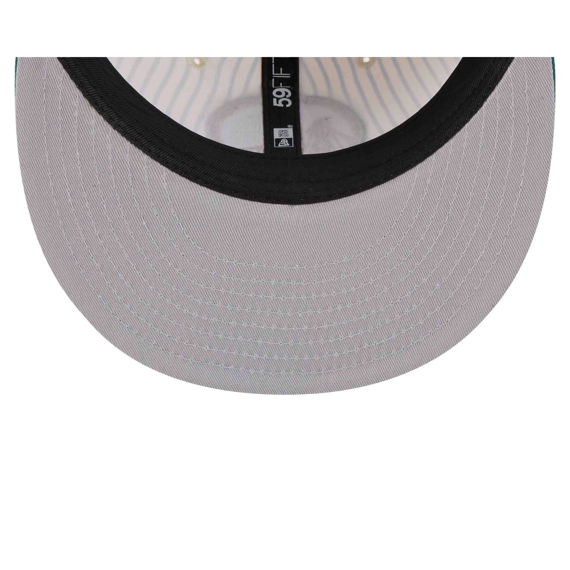 The Just Caps Seersucker Golden State Warriors Retro Crown 59FIFTY Fitted Cap features an embroidered Warriors green and bronze logo at the front panels against a seersucker fabrication throughout the cap. Additional details include matching NBA Logoman at the rear and a gray undervisor.