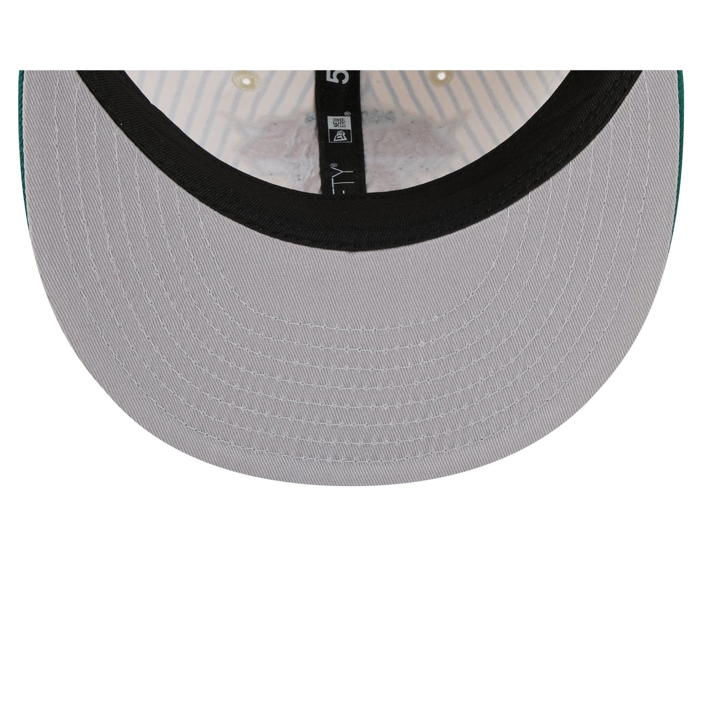 The Just Caps Seersucker New York Knicks Retro Crown 59FIFTY Fitted Cap features an embroidered Knicks green and bronze logo at the front panels against a seersucker fabrication throughout the cap. Additional details include matching NBA Logoman at the rear and a gray undervisor.