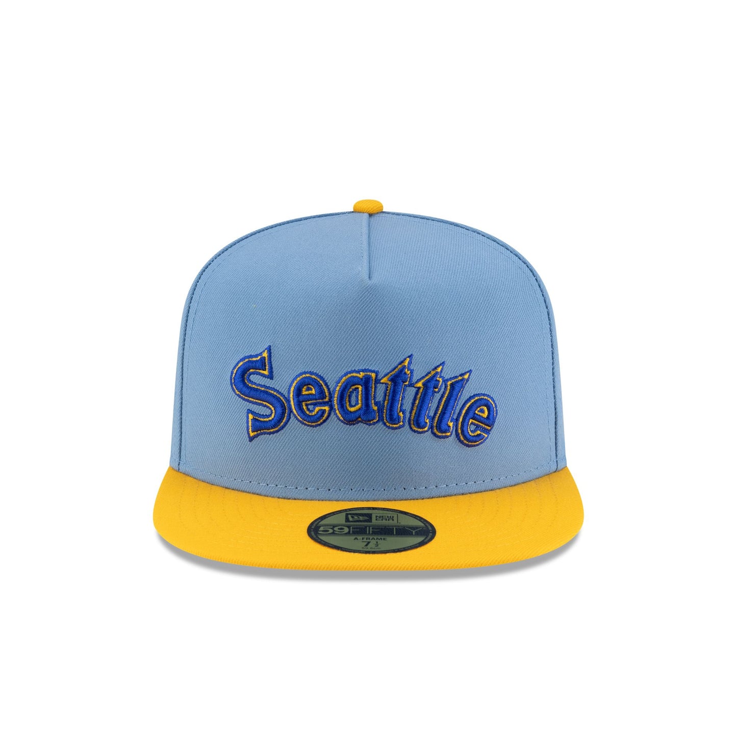 The Just Caps Sky Blue Seattle Mariners 59FIFTY A-Frame Fitted Cap features an embroidered Mariners Cooperstown logo at the front panels with a matching MLB Batterman logo at the rear. Additional details include a 40th Anniversary patch at the right-wear side and a gray undervisor.