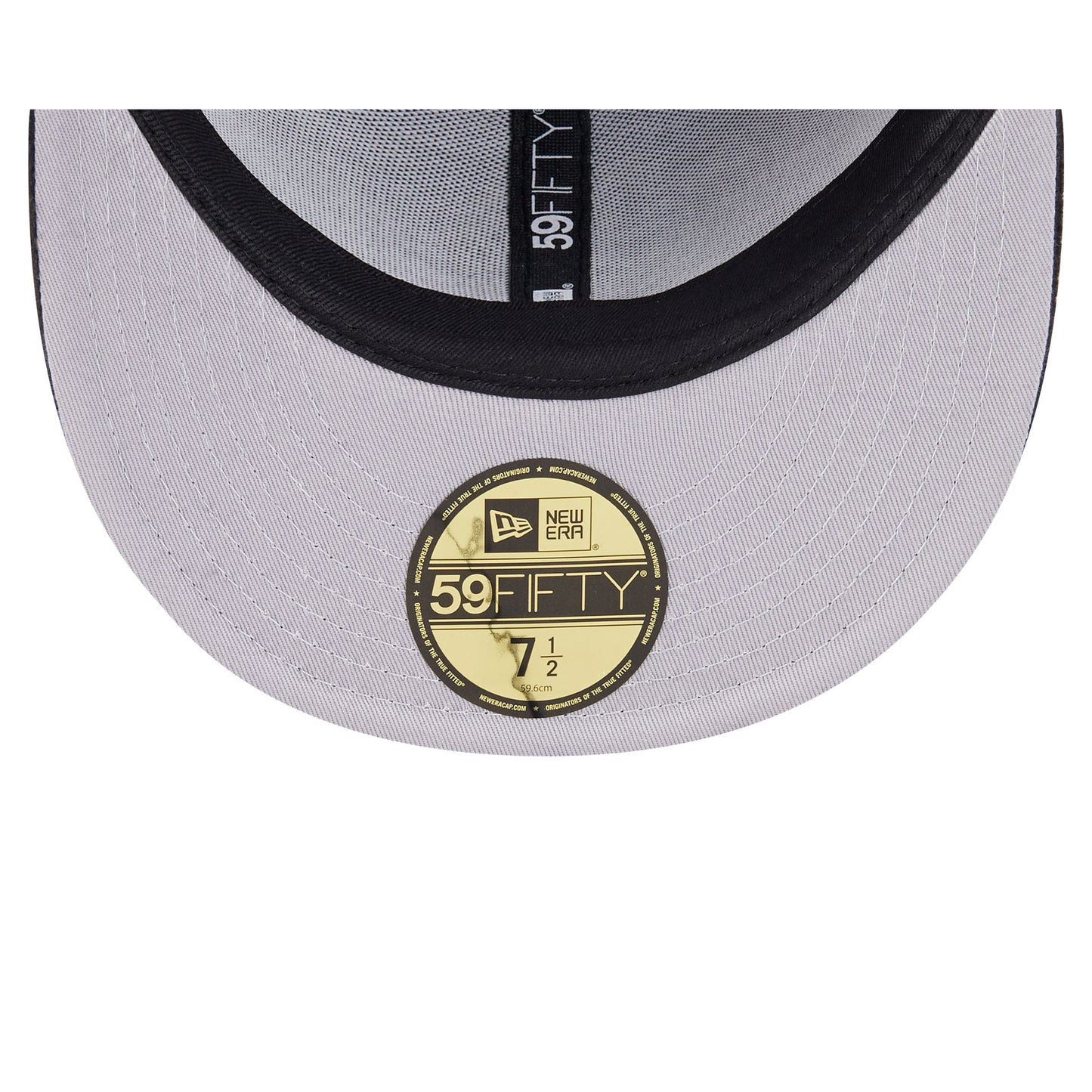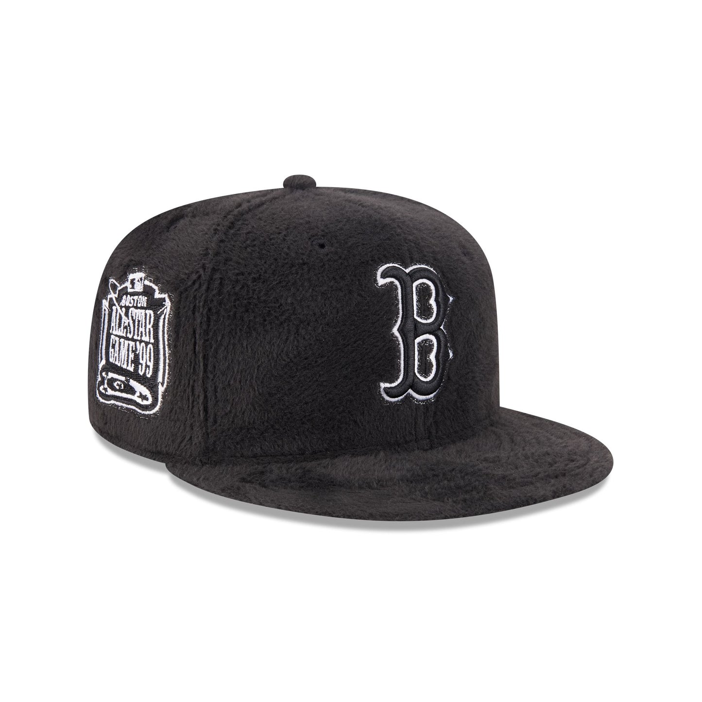 The Just Caps Static Logo Boston Red Sox 59FIFTY Fitted Cap features a black and white embroidered Red Sox logo at the front panels with a matching MLB Batterman logo at the rear. Additional details include a 1999 All-Star Game patch at the right-wear side with a black fleece allover fabrication and a gray undervisor.