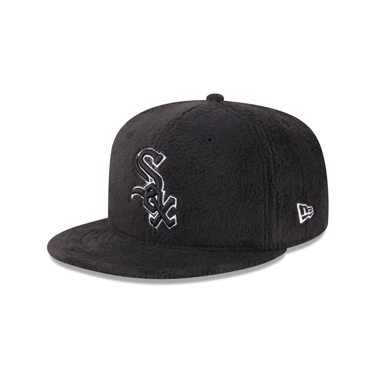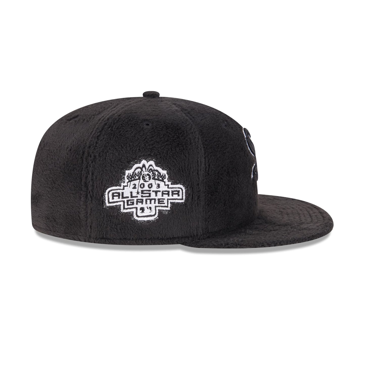 The Just Caps Static Logo Chicago White Sox 59FIFTY Fitted Cap features a black and white embroidered White Sox logo at the front panels with a matching MLB Batterman logo at the rear. Additional details include a 2003 All-Star Game patch at the right-wear side with a black fleece allover fabrication and a gray undervisor.