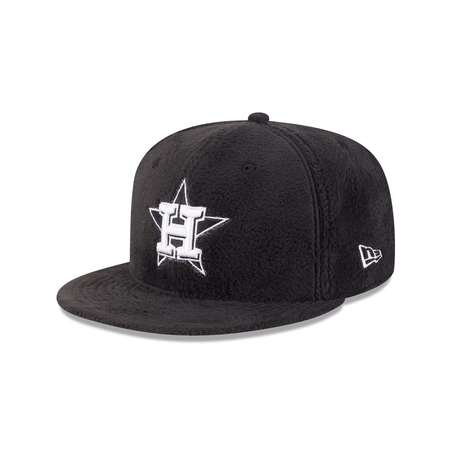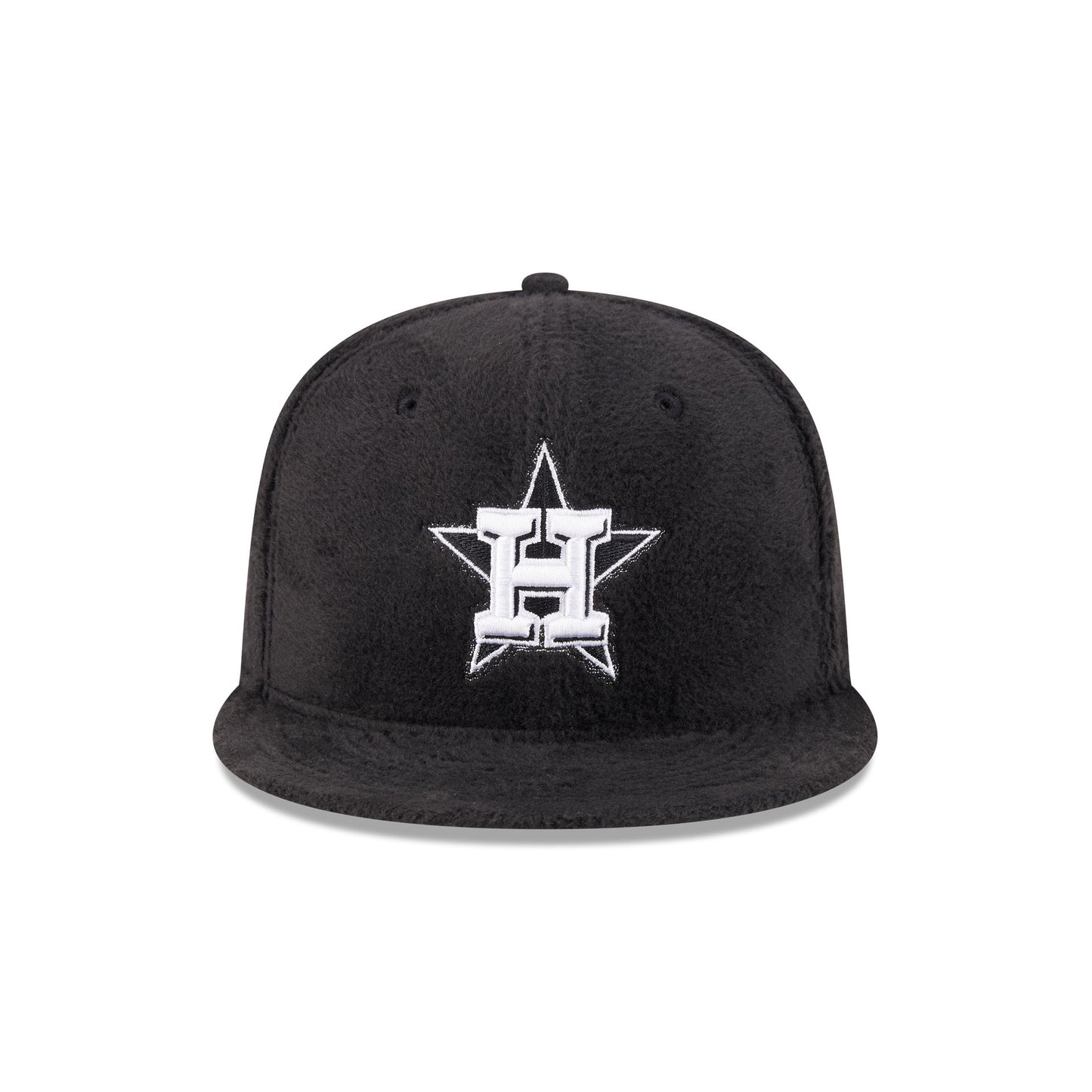 The Just Caps Static Logo Houston Astros 59FIFTY Fitted Cap features a black and white embroidered Astros logo at the front panels with a matching MLB Batterman logo at the rear. Additional details include a 1986 All-Star Game patch at the right-wear side with a black fleece allover fabrication and a gray undervisor.