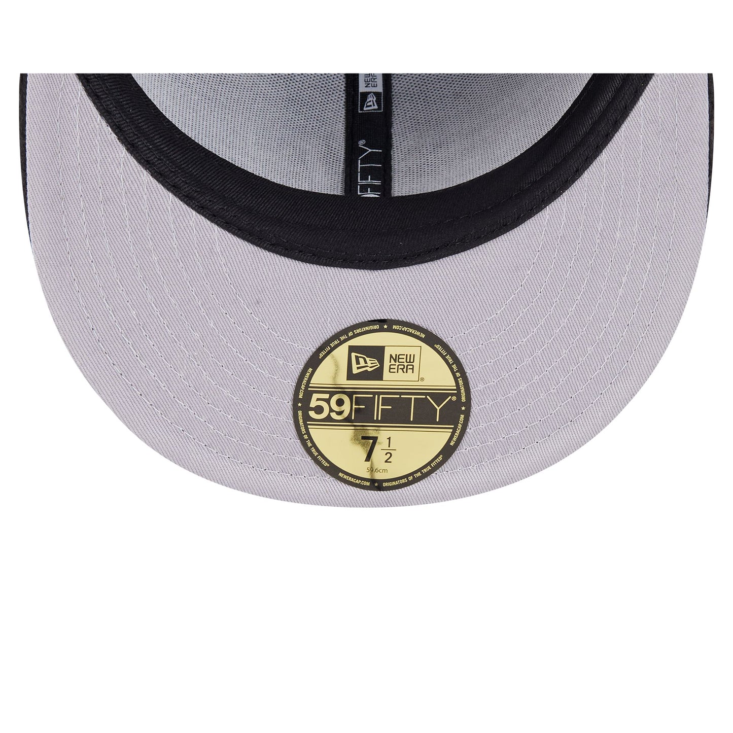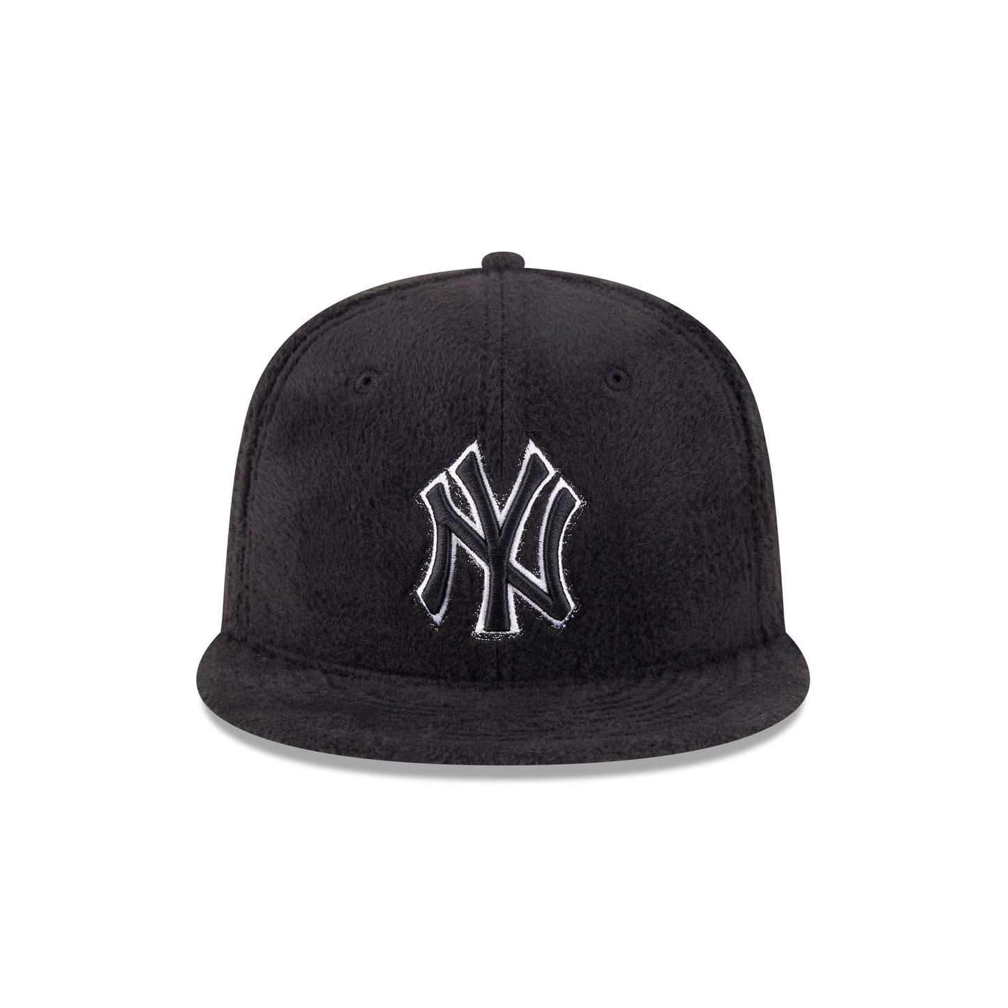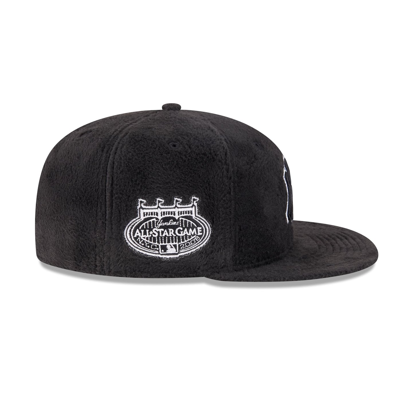 The Just Caps Static Logo New York Yankees 59FIFTY Fitted Cap features a black and white embroidered Yankees logo at the front panels with a matching MLB Batterman logo at the rear. Additional details include a 2008 All-Star Game patch at the right-wear side with a black fleece allover fabrication and a gray undervisor.