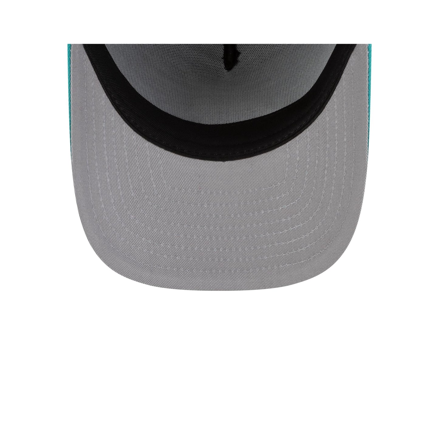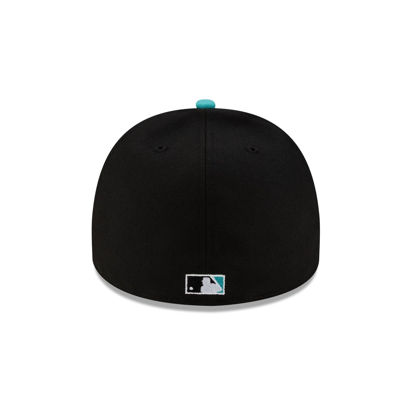 The Just Caps Upside Down Logo Miami Marlins 59FIFTY A-Frame Fitted Cap features an embroidered upside down Marlins Cooperstown logo at the front panels with a 30th Anniversary patch at the right-wear side. Additional details include a matching MLB Batterman logo at the rear and a gray undervisor.