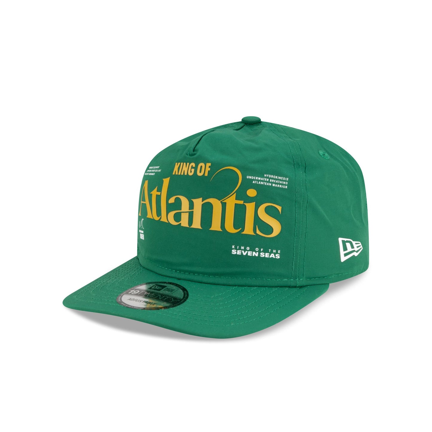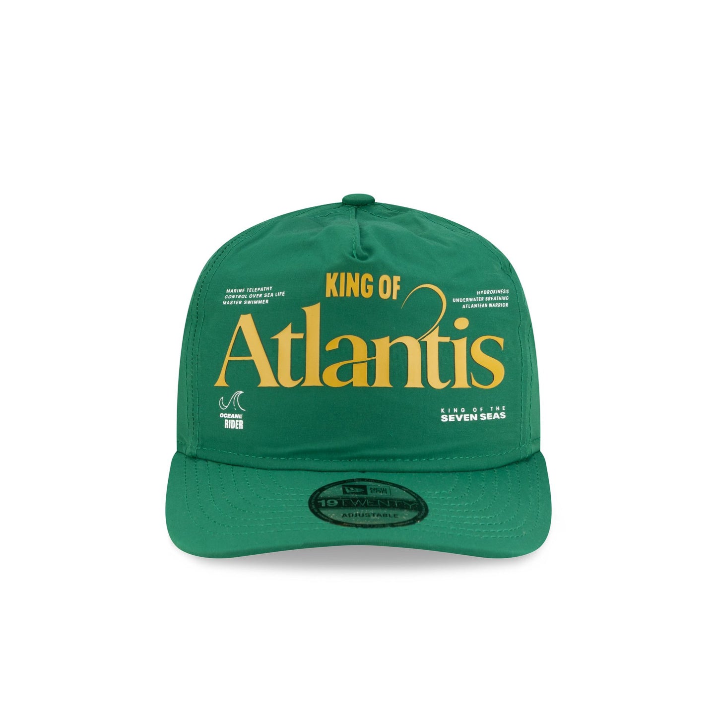 The Justice League of America Atlantis 19TWENTY Adjustable Cap features a screen-printed Atlantis wordmark at the front panels with an Aquaman logo at the right-wear side. Additional details include a DC Comics logo to the left of an adjustable snap closure at the rear.