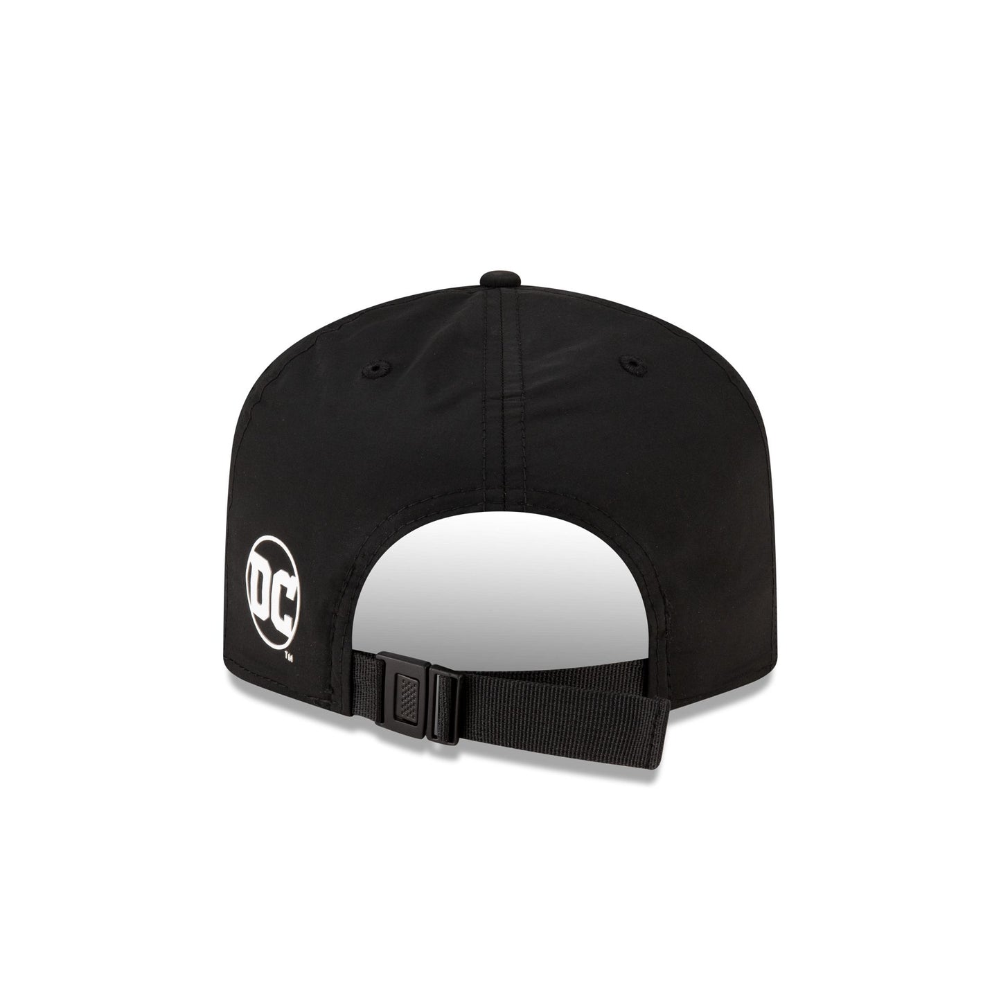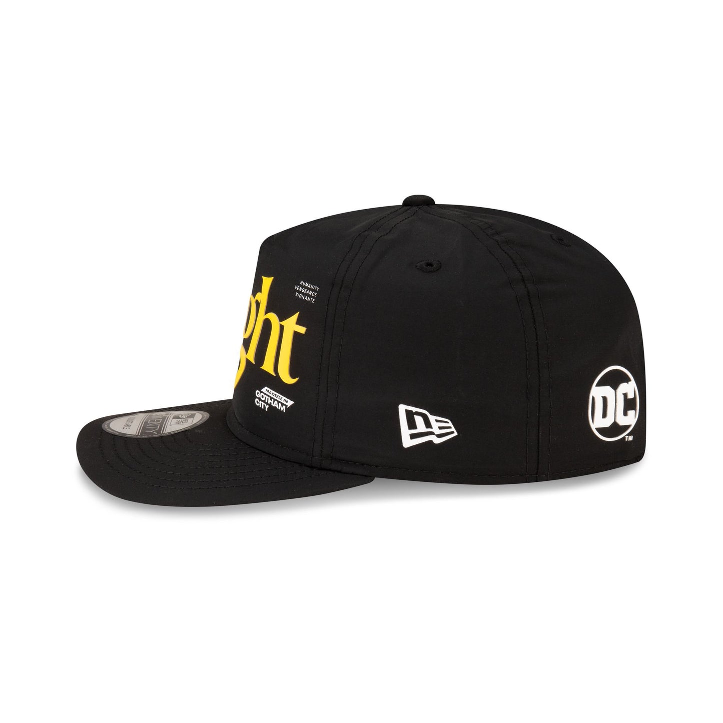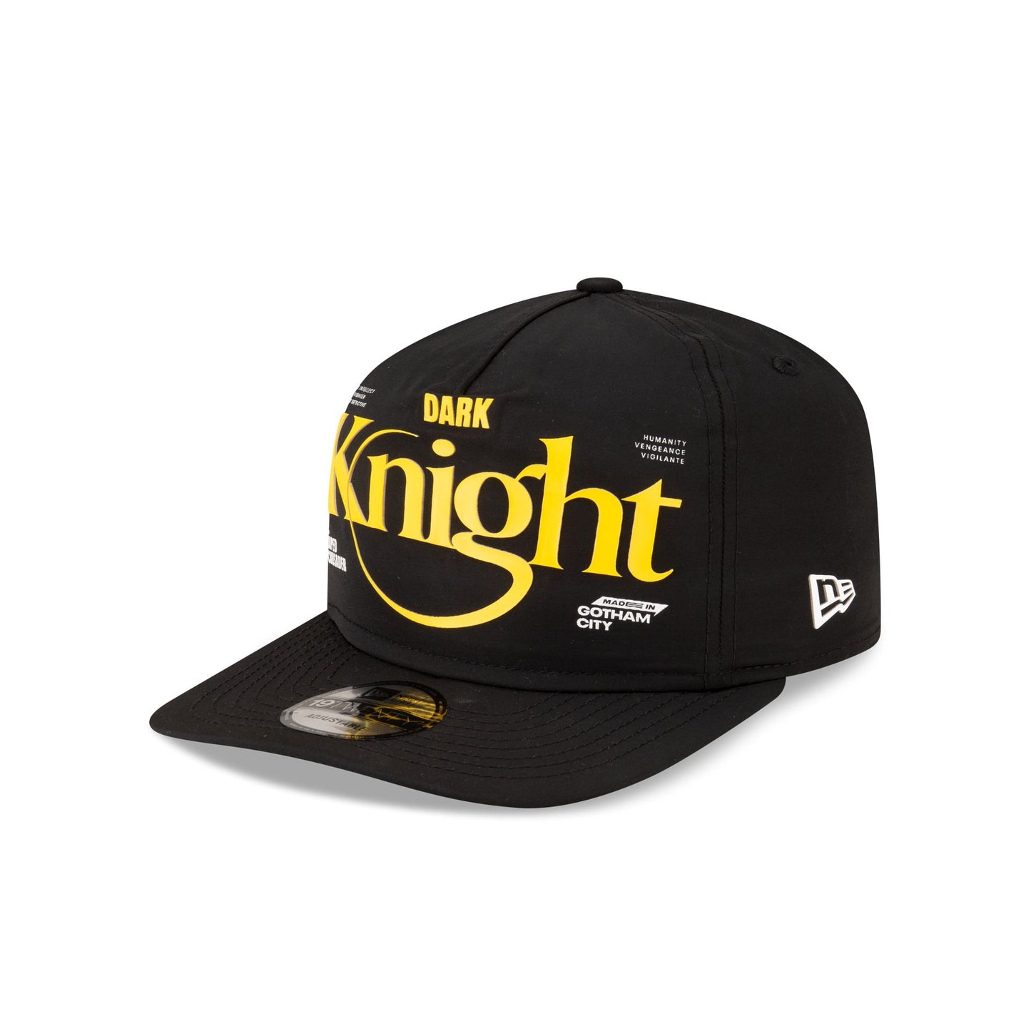 The Justice League of America Dark Knight 19TWENTY Adjustable Cap features a screen-printed Dark Knight wordmark at the front panels with a Batman logo at the right-wear side. Additional details include a DC Comics logo to the left of an adjustable snap closure at the rear.