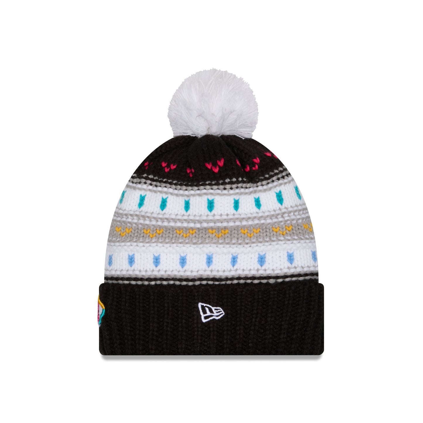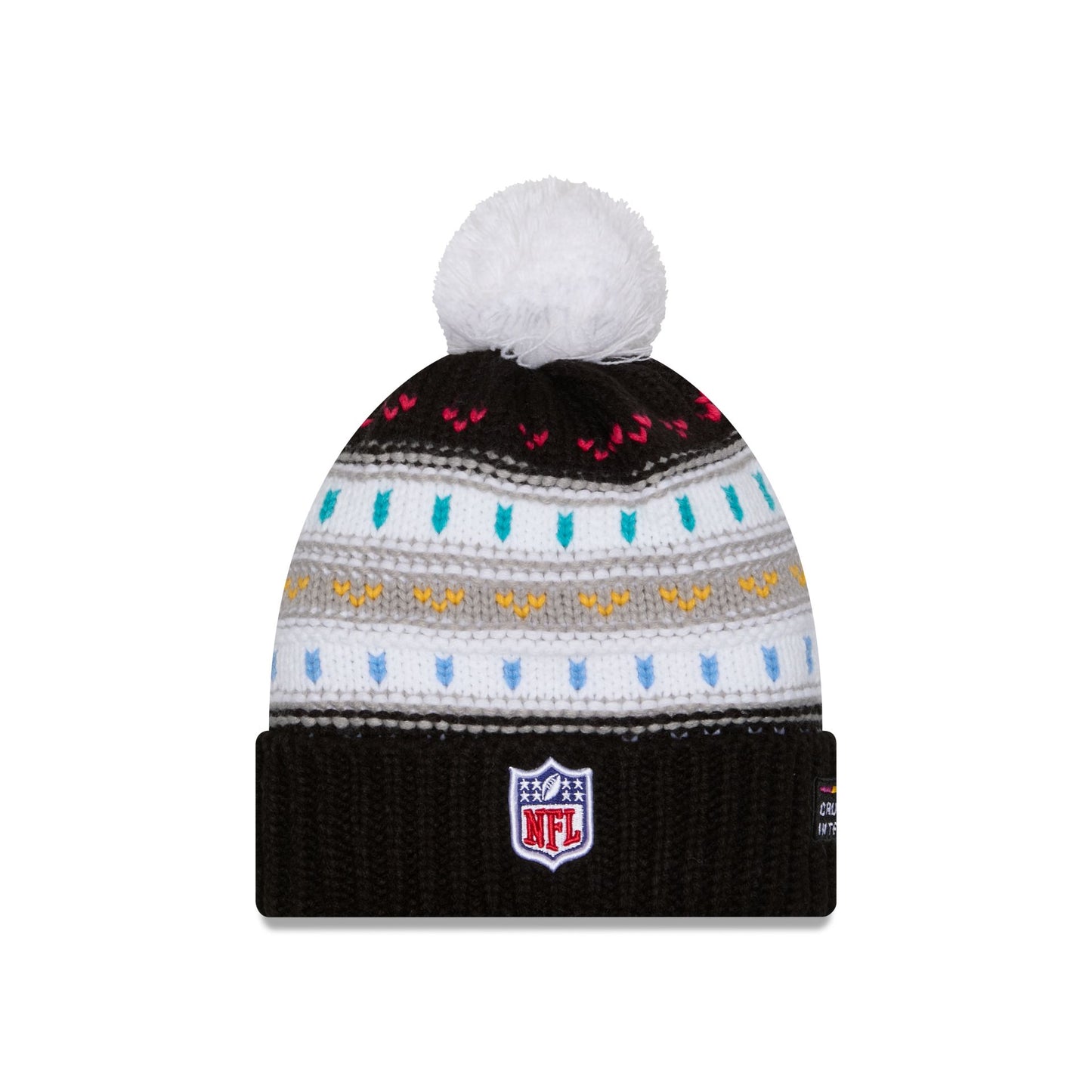 The Kansas City Chiefs 2025 Crucial Catch Women's Pom Knit features an embroidered Chiefs logo at the front with an NFL Shield at the rear, a Crucial Catch Intercept Cancer patch at the right-wear side, and a one-time removeable pom.