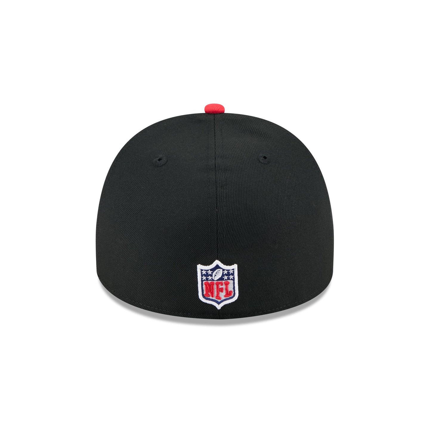 The Kansas City Chiefs 2025 Draft Black 59FIFTY Fitted Cap features an embroidered Chiefs logo and wordmark at the front panels with a pin at the left. Additional details include an NFL Shield logo at the rear, ornamental stitched details at the visor, and a gray undervisor.