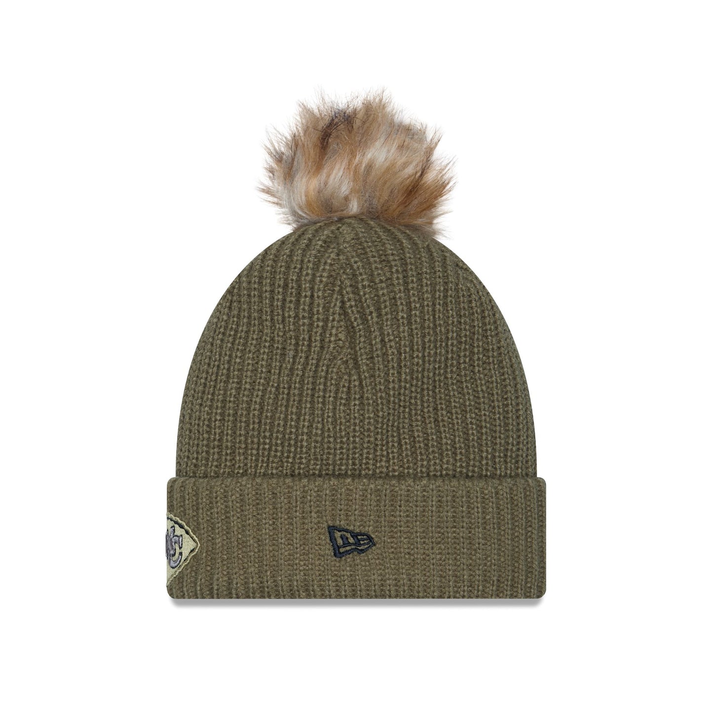 The Kansas City Chiefs 2025 Salute to Service Women's Pom Knit features an embroidered Chiefs logo at the front with an American flag patch at the right-wear side, the official NFL Salute to Service patch at the rear, and a one-time removeable pom.