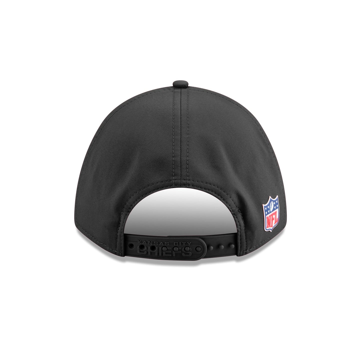The Kansas City Chiefs 2025 Sideline Cold Weather Steel Clouds 9FORTY M-Crown Snapback features a sewn-down silicone Chiefs logo patch at the front panels with a water-repellent quill tech fabrication throughout and a quick-dry cushioned sweatband to absorb moisture. Additional details include the Official NFL Shield logo to the right of a soft silicone snapback closure at the rear. The crown has bonded seams to trap warmth and the undervisor is accented with a silicone transfer in the team’s colors.