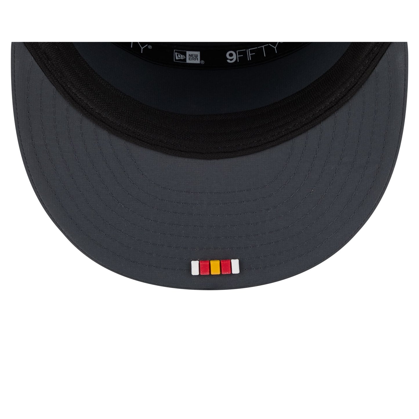The Kansas City Chiefs 2025 Sideline Cold Weather Steel Clouds Split Panel 9FIFTY Snapback features a sewn-down silicone Chiefs logo patch at the front panels with a split-crown construction and diamond quilting. The cap has a water-repellent quill tech fabrication throughout, with a quick-dry cushioned sweatband to absorb moisture. Additional details include the Official NFL Shield logo to the right of a soft silicone snapback closure at the rear with eyelets at each side panel. The undervisor is accented with a silicone transfer in the team’s colors.