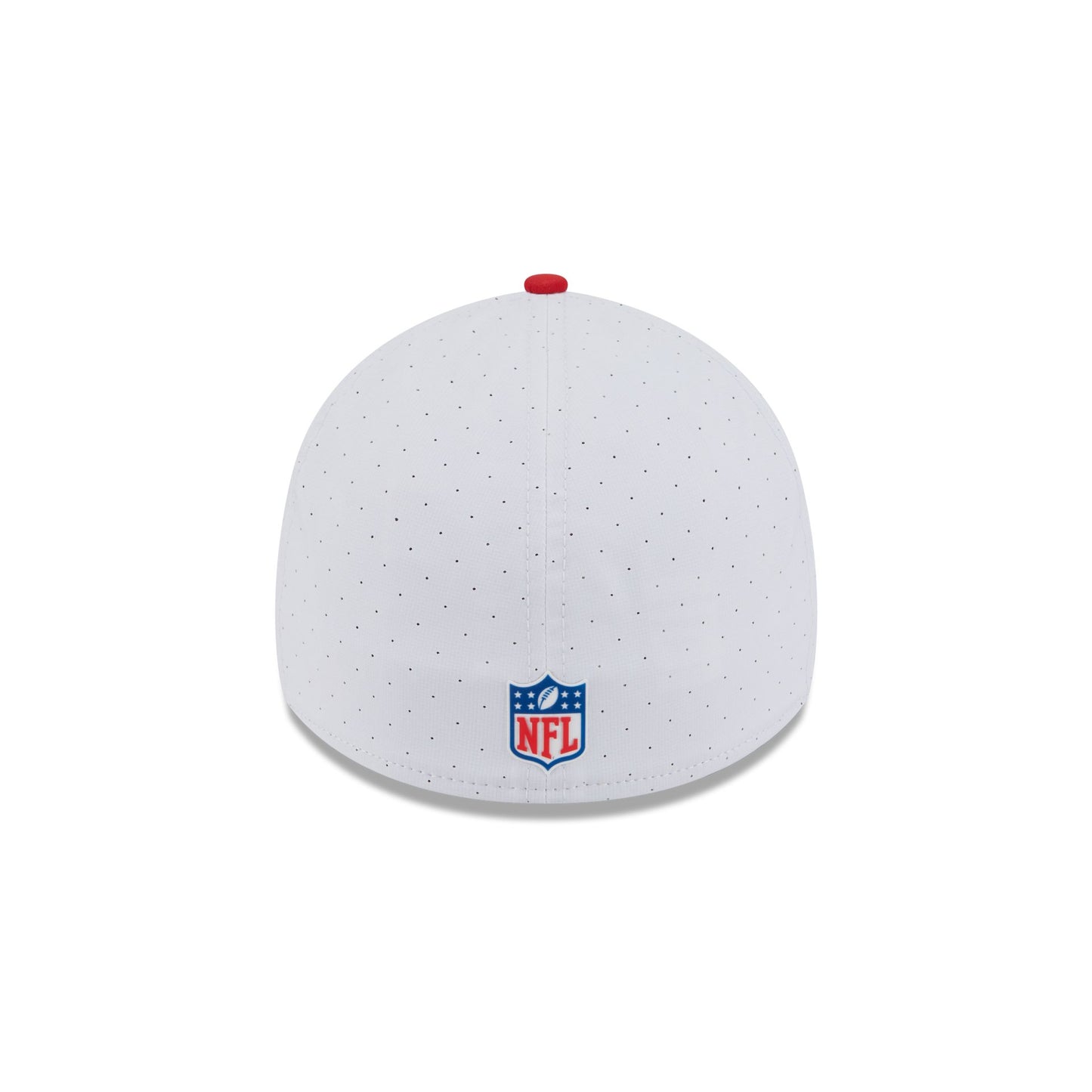 The Kansas City Chiefs 2025 Training 39THIRTY Stretch Fit Cap features a silicone Chiefs patch at the front panels with team color stripes at the front of a red visor and a silicone NFL Shield patch at the rear.