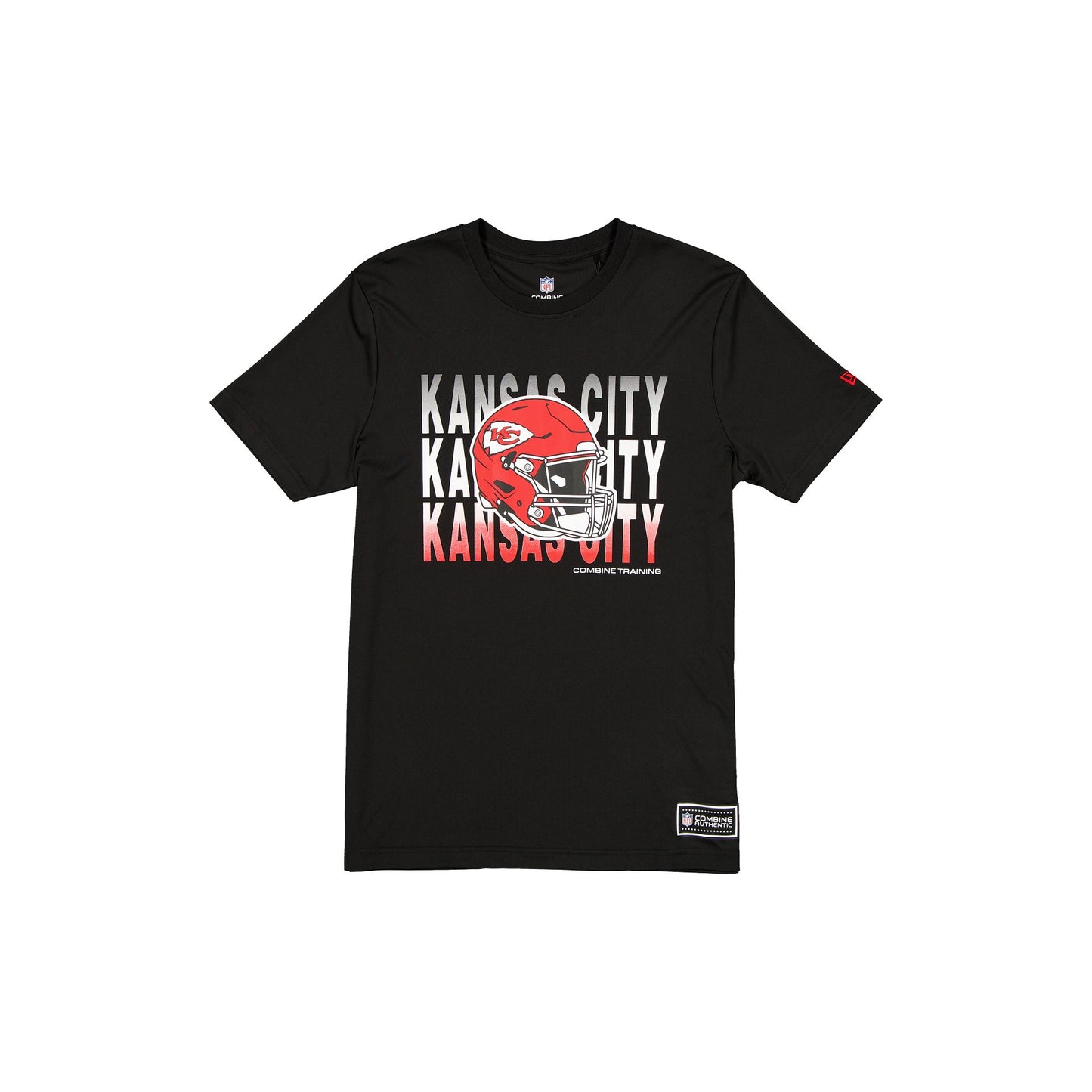 The Kansas City Chiefs 2025 Training Black T-Shirt features a screen-printed Chiefs helmet graphic at the chest with a heat sealed NFL Combine Authentic jock tag at the hem.