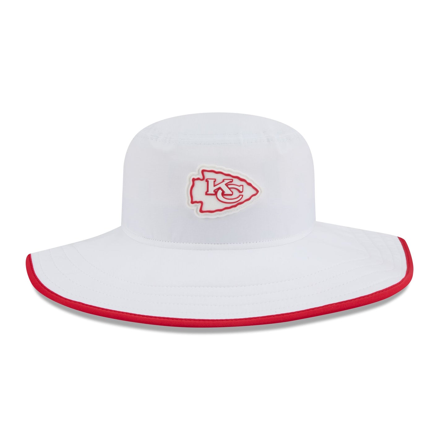 The Kansas City Chiefs 2025 Training Panama Bucket Hat features a silicone Chiefs patch at the front panel with team color piping along the edge and a silicone NFL Shield patch on a woven foldover tab at the rear.