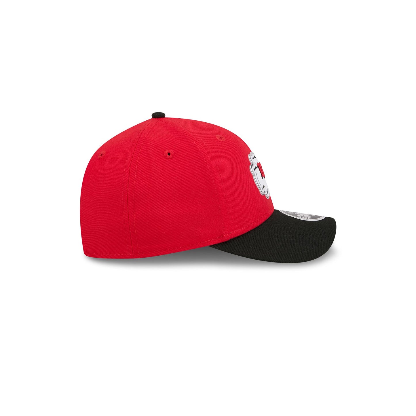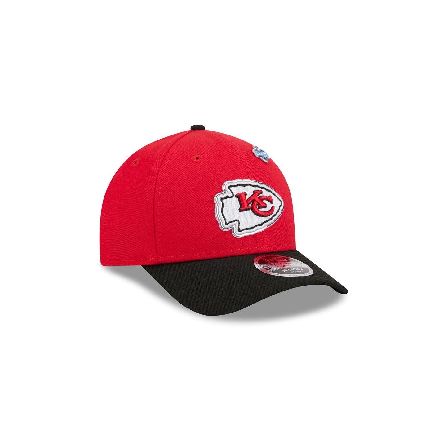 The Kansas City Chiefs 2026 Draft Kids 9FORTY M-Crown Snapback features a heat sealed liquid chrome Chiefs patch and an Official 2026 NFL Draft pin at the front panels with an NFL Shield above a team wordmark on a snapback closure at the rear. Additional details include a city inspired interior fabrication with a Chiefs Kingdom wordmark at the rear tape, a chrome New Era Flag at the left-wear side, and a black visor.