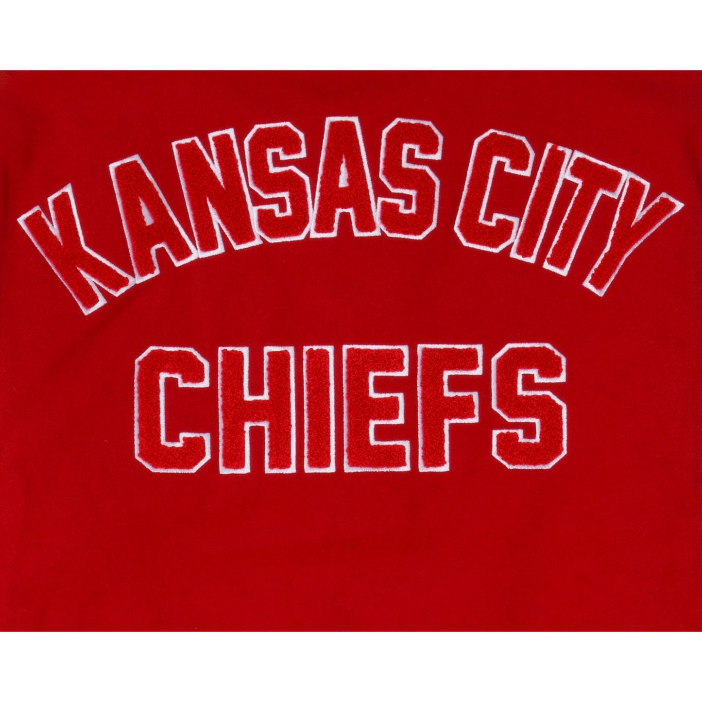 The Kansas City Chiefs 3rd Down Jacket features an embroidered Chiefs logo and conference patch with a team wordmark at the front and a chenille team name at the rear. Additional details include pebbled sleeves and a snap button closure.