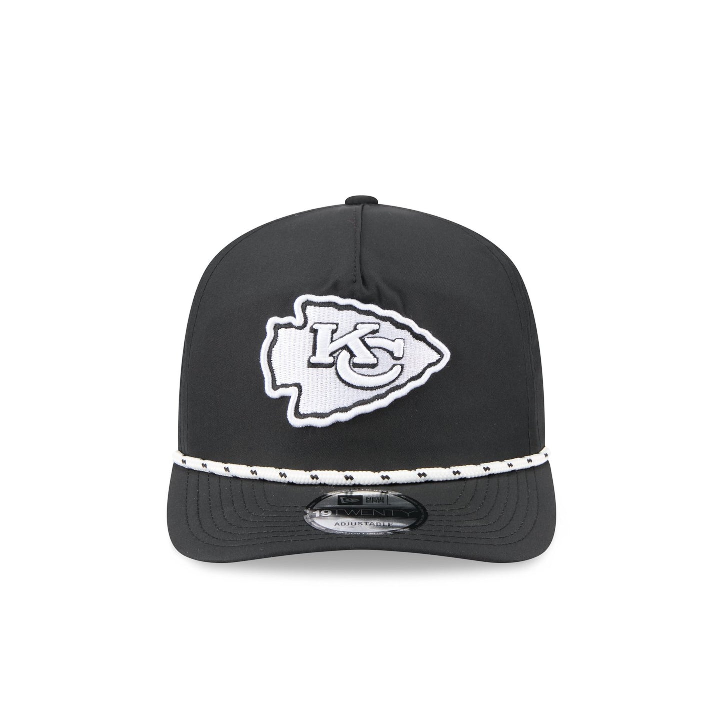 The Kansas City Chiefs Black and White Rope 19TWENTY Snapback features an embroidered Chiefs logo and rope at the front with a snapback closure at the rear and a gray undervisor.