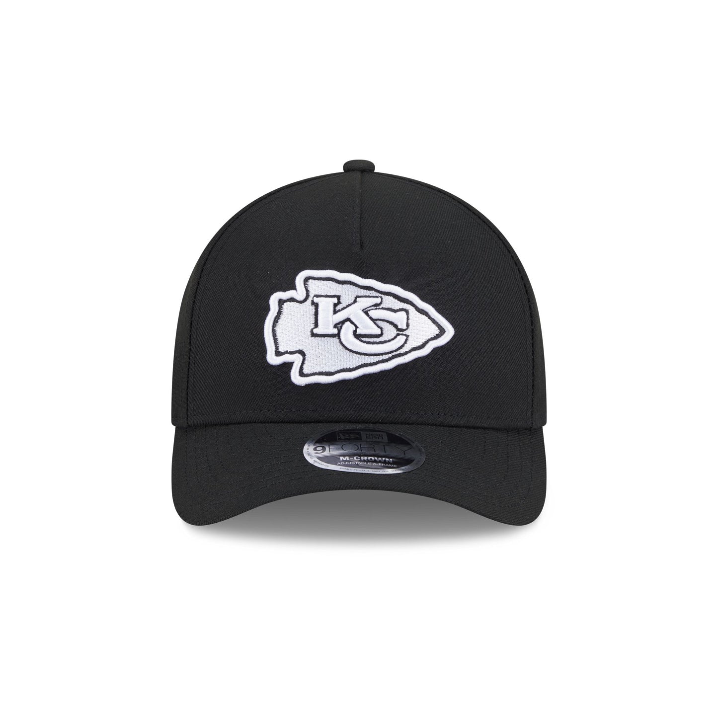 The Kansas City Chiefs Black & White 9FORTY M-Crown A-Frame Snapback features an embroidered Chiefs logo at the front panels with an adjustable snapback closure at the rear and a gray undervisor.
